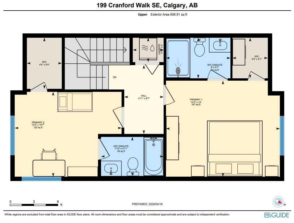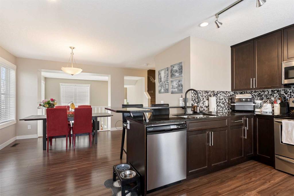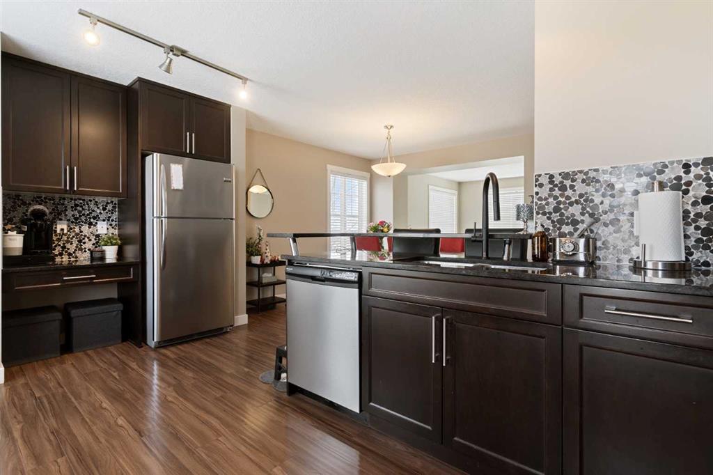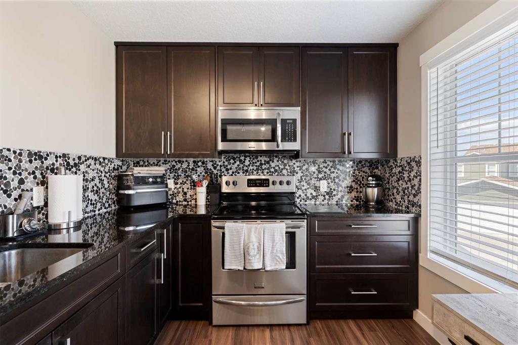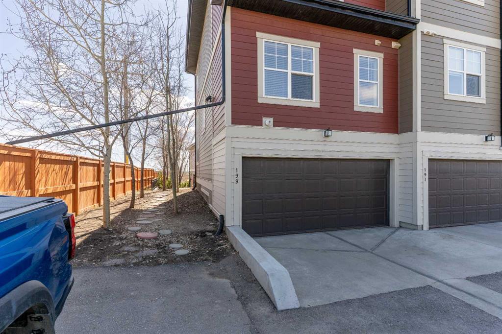 NOW is the TIME – RARE Double WIDE Attached-Garage, upgraded 1235 sq ft double-Primary Townhome in beautiful condition for $400k – additional Parking and THIS home is perfect for those who love seeing NO ONE and NOTHING but Views all around! SEE Detailed Floor Plans, and 3D iGuide Virtual Tour for best experience! Prime location – sole end unit with one neighbour, close to pathways in quietest highest corner of Harvest Mosaic – your personal Patio is quiet, by the community screening fence. The Main Foyer and Living Room is vaulted, with HUGE 2-sided Windows. Up half a flight is the full-sized Dining Room and Kitchen, brilliantly split into a Coffee Bar/Pantry, with the stainless Fridge outside of the main cooking area, where the existing raised 3 to 4 person Eating Bar can be enhanced by a floating chop-block island for utility. Granite counters, unique splash tile, and dark Cabinets are contemporary styled, and the glass top Range, over-the-range Microwave Hood and Dishwasher are also in stainless steel. Hard plank floors and tiles enhance the vibe. Upstairs, double Primary Bedrooms both hold King-sized furnishing (one is current-use Office/Guest/Pup) each has a private Ensuite, Granite vanities, a walk-in shower or tub/shower unit AND both have large Walk-in Closets, with organiser shelves in addition to hanging. The wide landing at the top of the stair gives room for in-suite Laundry days, or, use as a reading Loft! As a bonus, the lowest level is partially developed with drywall, with room for Games AND Storage – just enclose the recently cleaned/serviced Furnace and 60 Gallon Hot Water Tank. Enjoy BBQ year round on the concrete patio, with hedge surroundings, perfect for you, friends, family, or your closest canine friend (one)! Harvest Mosaic in Cranston uses solar panels, micro inverters and motion security lights at the pathways, composite siding, masonry, iron railings, all for highest value and longevity – great reserve plan and maintenance (new RFSR is in the works). Don’t wait to experience 199 Cranford Walk SE today – agents can see documents immediately in supplements.