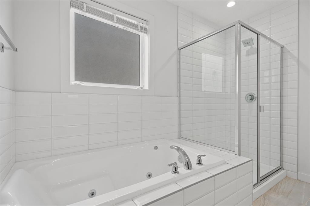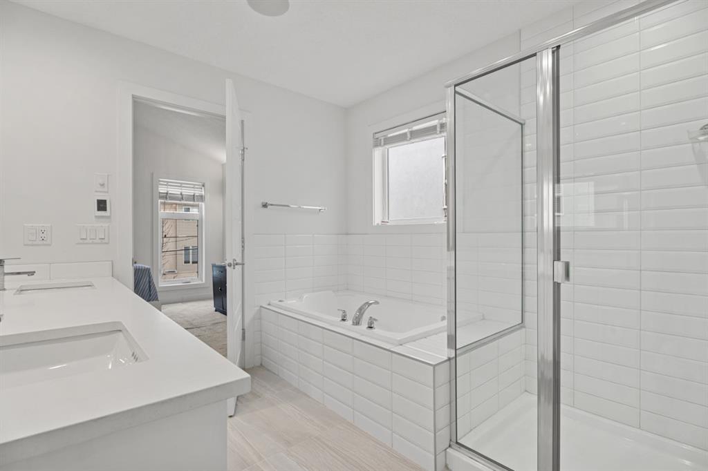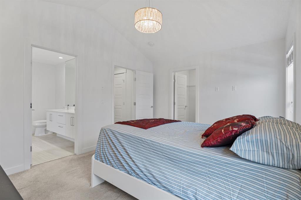 Upstairs, two private bedroom suites offer exceptional comfort. The vaulted primary retreat is a true sanctuary, complete with a walk-in closet and a spa-inspired five-piece ensuite featuring heated floors and a calming, retreat-like atmosphere.