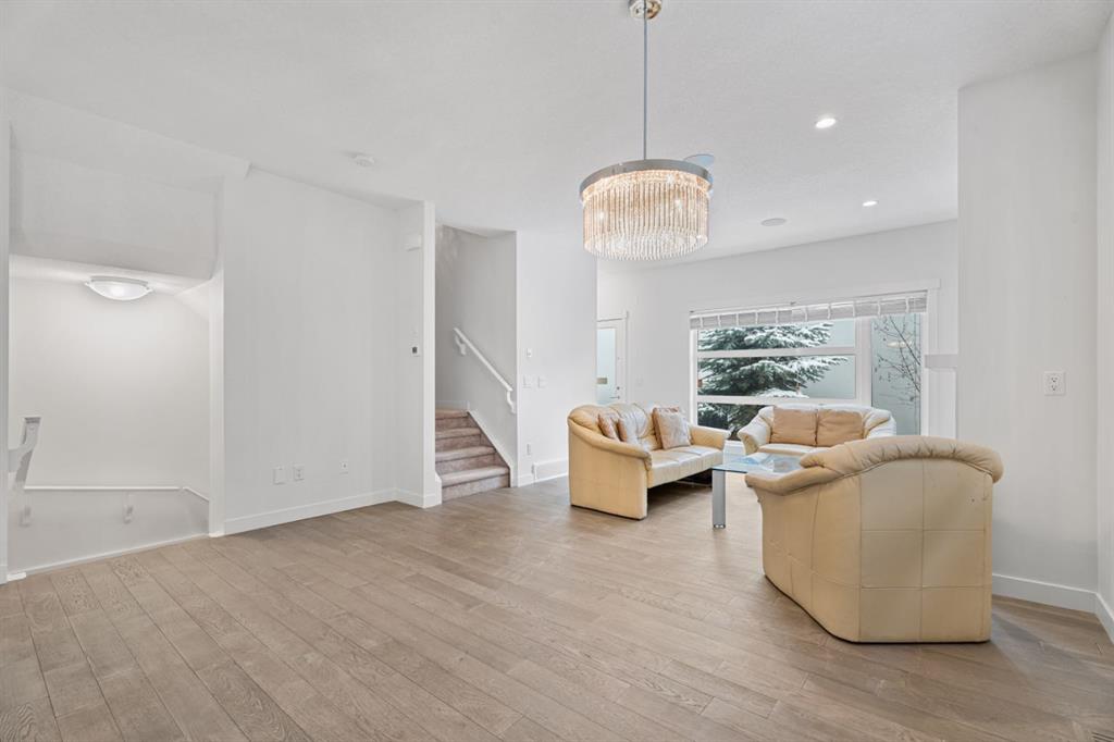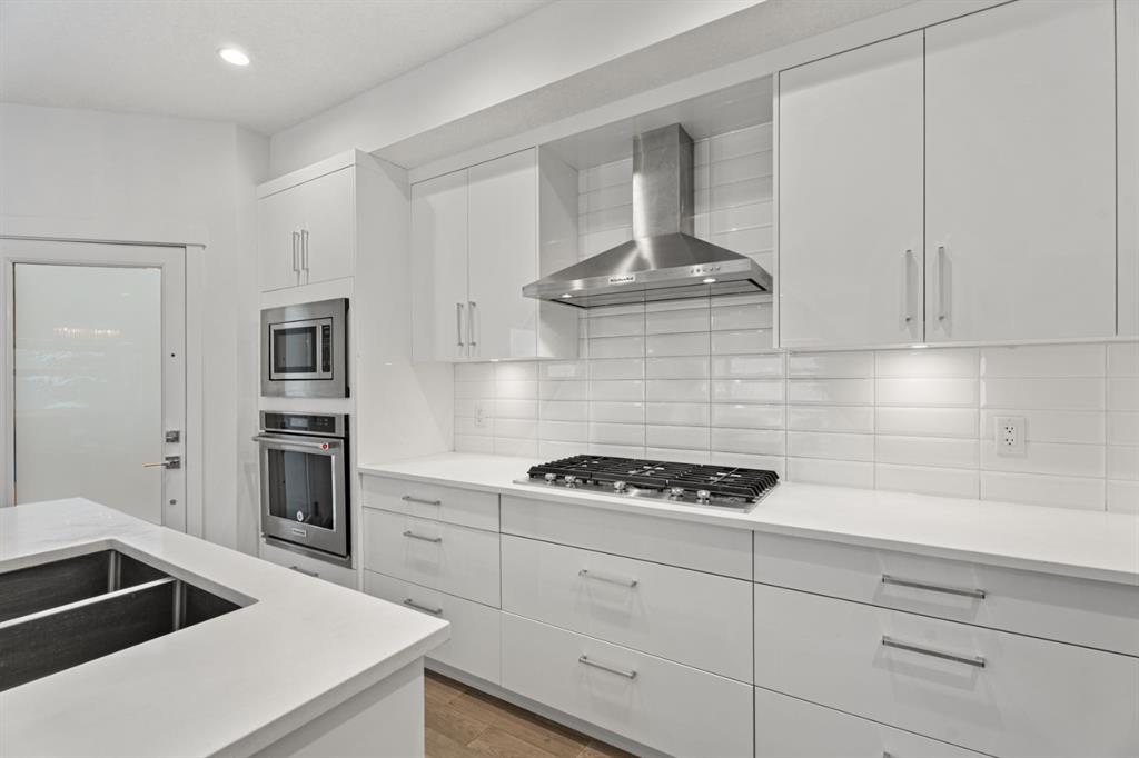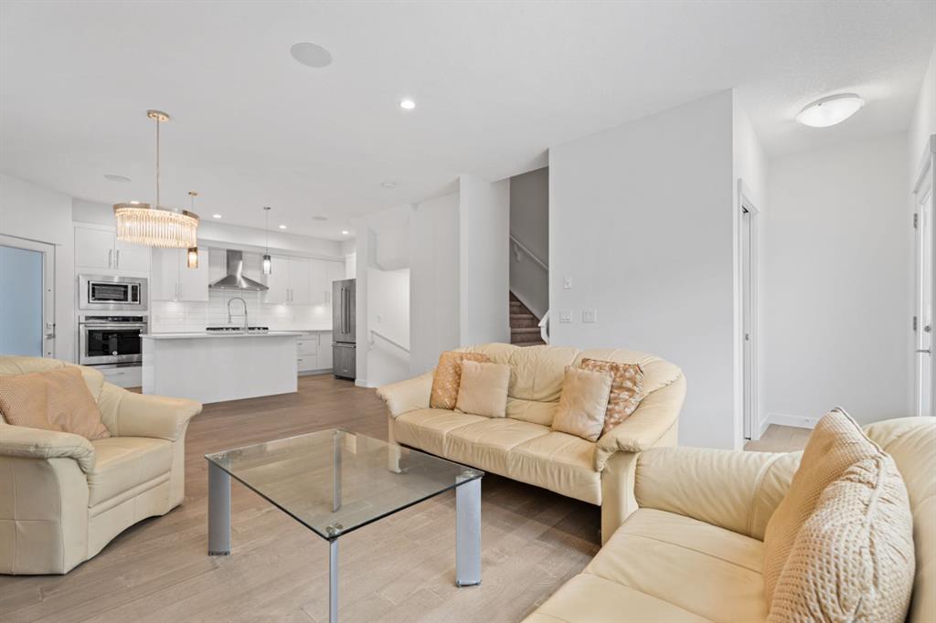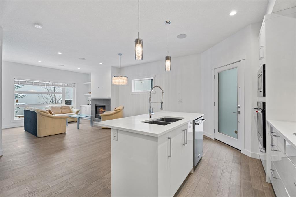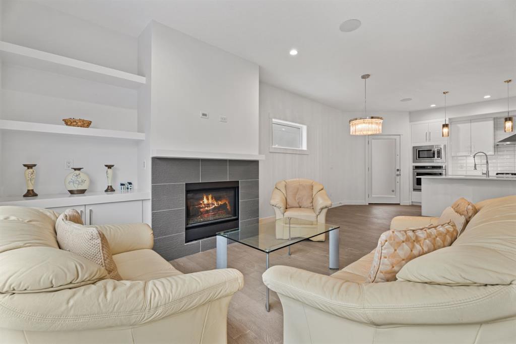 Designed with intention, the open-concept main level blends modern elegance with everyday comfort. Engineered flooring flows throughout, while a statement gas fireplace and custom built-ins create warmth and character. The chef-inspired kitchen showcases quartz countertops, stainless steel appliances, abundant cabinetry, and a generous island designed for gathering and effortless entertaining.
