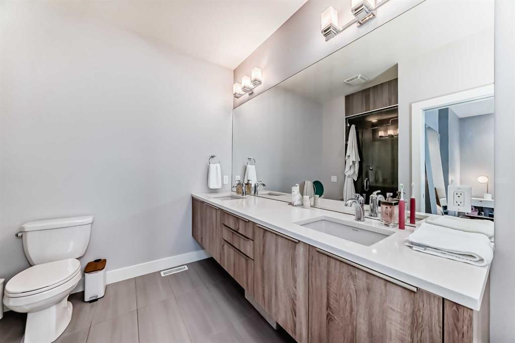 The open-concept main floor is built around a stunning chef’s kitchen featuring full-height dual-tone cabinetry, quartz counters, a large walk-around island with bar fridge, panelled dual fridges, panelled dishwasher, countertop gas stove, built-in oven, a large pantry, 3-stage under-sink water filtration, and under-mount sink. The bright dining area and living room centre around a gas fireplace flanked by built-in cabinetry on both sides. A private 2-piece bathroom completes the main level. East-facing French doors open to your beautifully finished private backyard — a true zero-maintenance oasis with natural stone stepping paths, clover ground cover, a lovely garden area, and a gas BBQ line, with direct access to the garage.