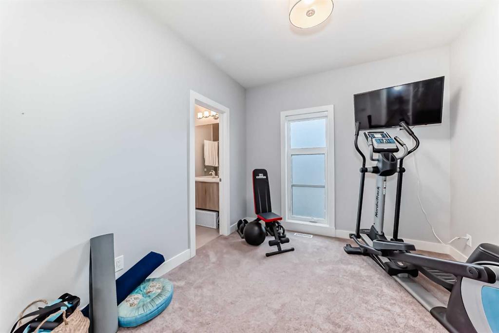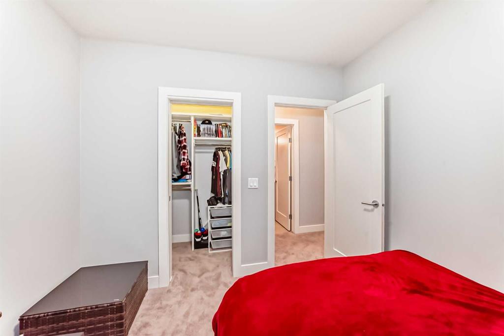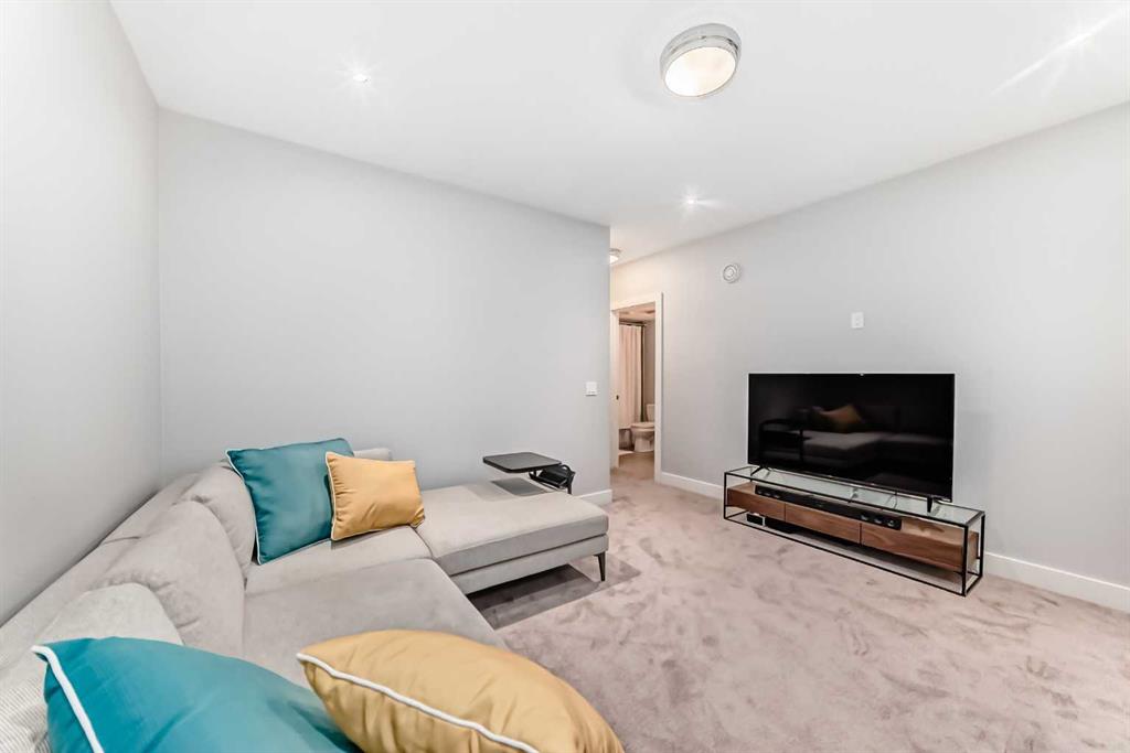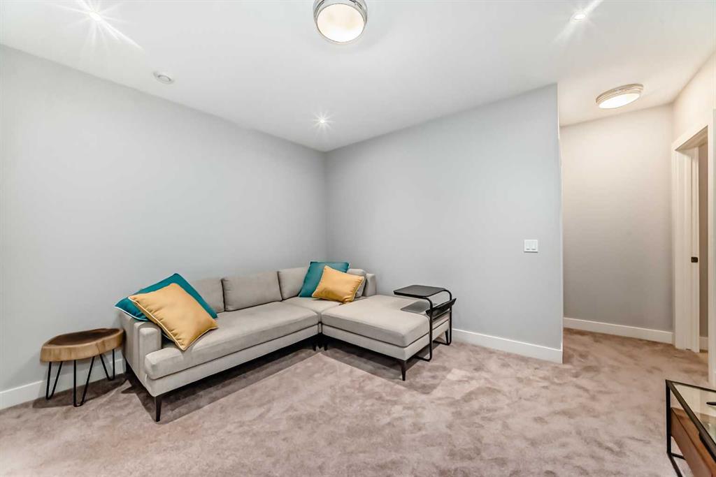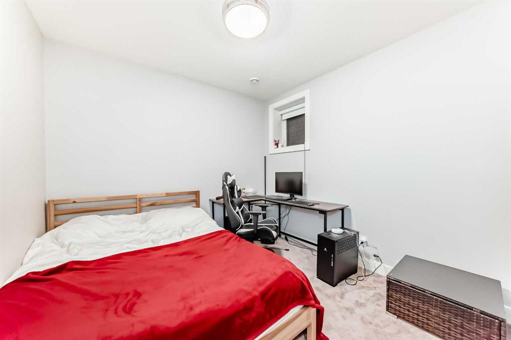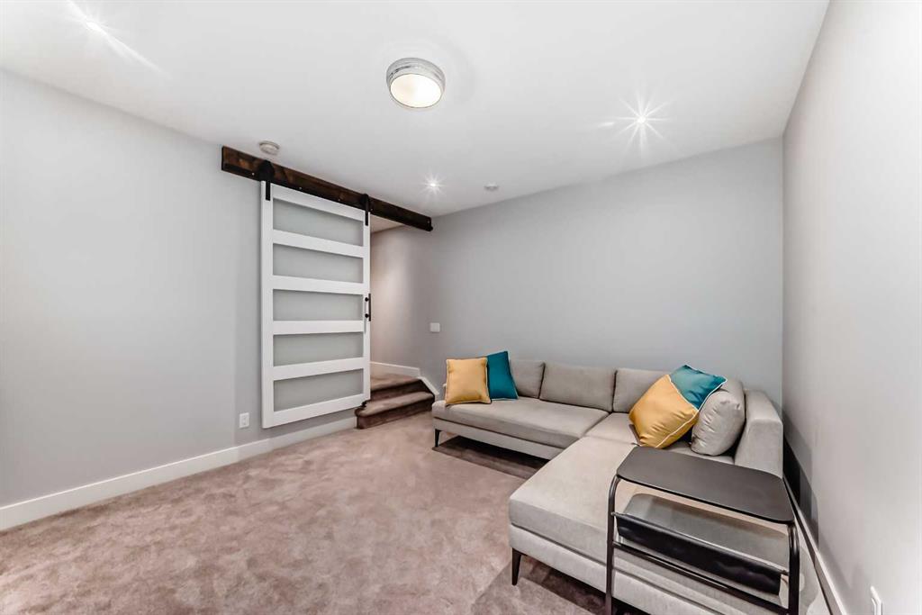 The fully finished basement features a barn door for added privacy, a large rec room, 3rd bedroom with walk-in closet, 4-piece bathroom with tub/shower combo, and excellent storage throughout.