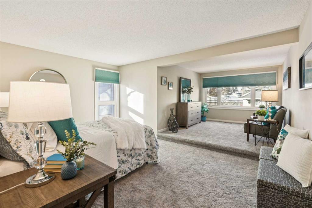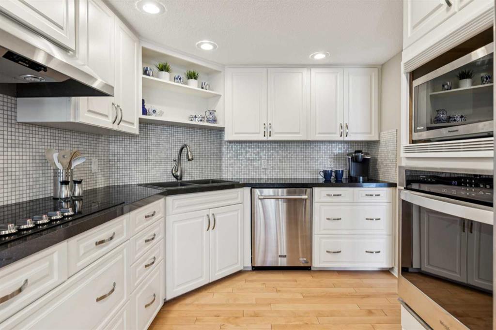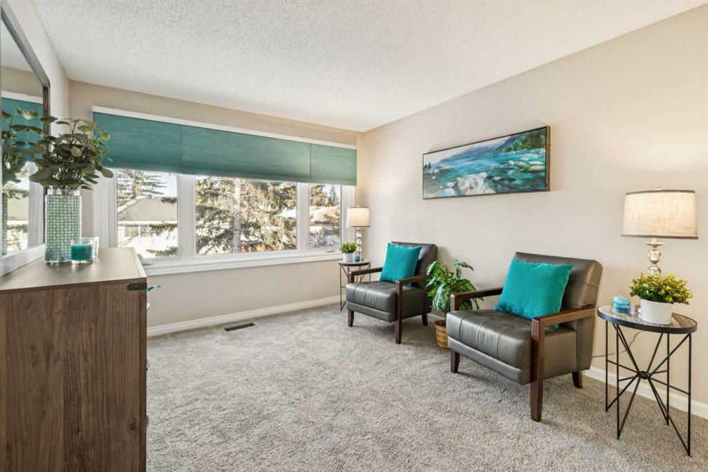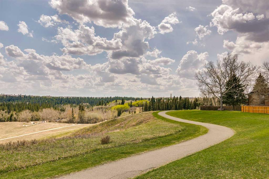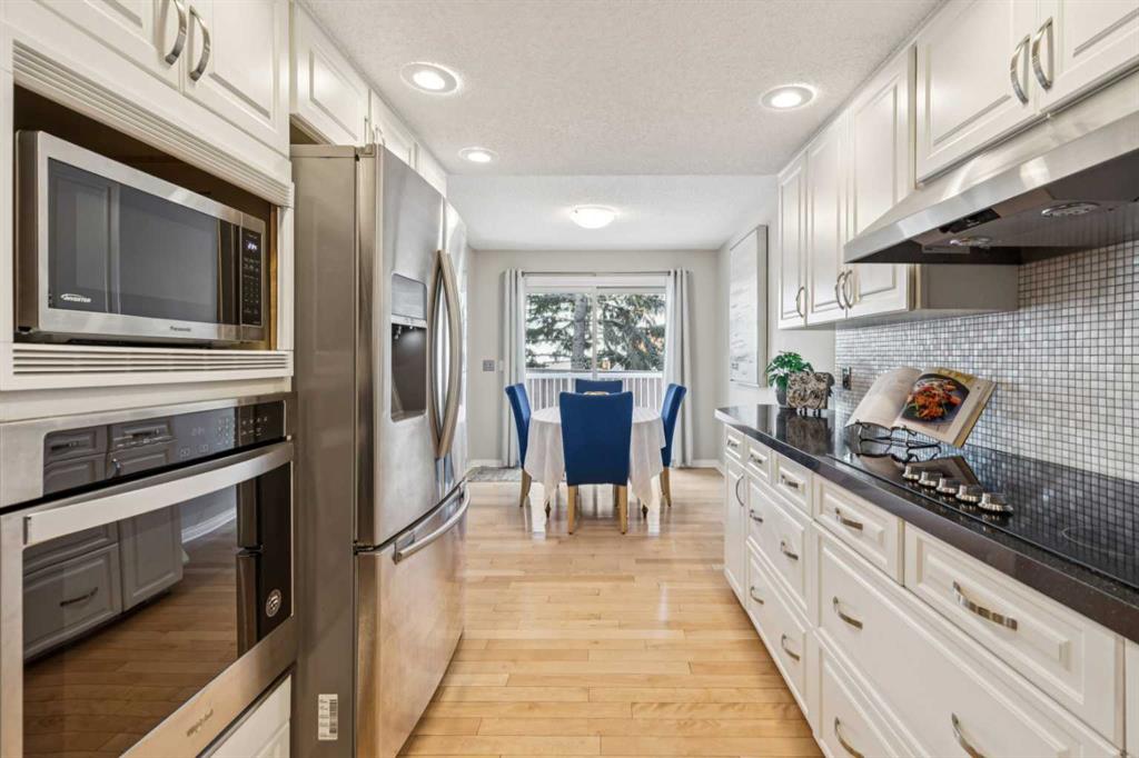 STYLISH, TASTEFULLY RENOVATED TOWNHOME offering 3 BEDROOMS and a MAIN FLOOR DEN plus FINISHED BASEMENT and ATTACHED DOUBLE GARAGE with private driveway that will hold another two cars. AMAZING LOCATION! This complex backs to FISH CREEK PARK and offers easy access to the parks and pathways for outdoor adventures. MANY UPGRADES! New upstairs windows (2022), new furnace (2025), and 2 new hot water tanks (2025), water softener (2025), central air (2022), main floor bath upgraded to a 3-piece, new oven and stovetop in kitchen (2022). Huge primary bedroom has a 5-piece ensuite (jetted tub, separate shower, skylight). This is a home that you really must see!