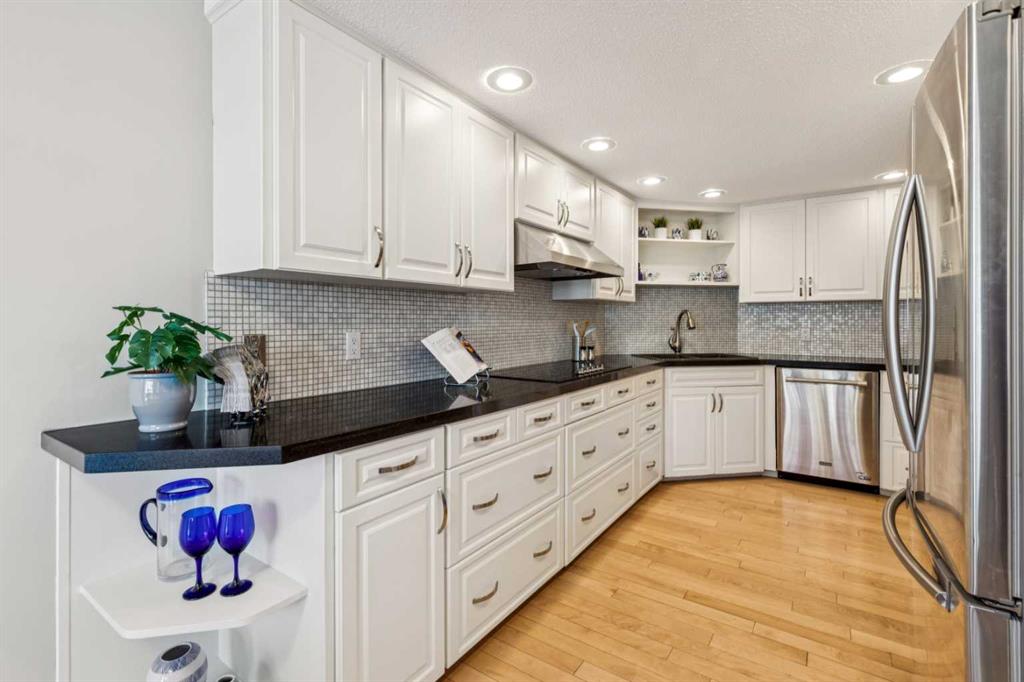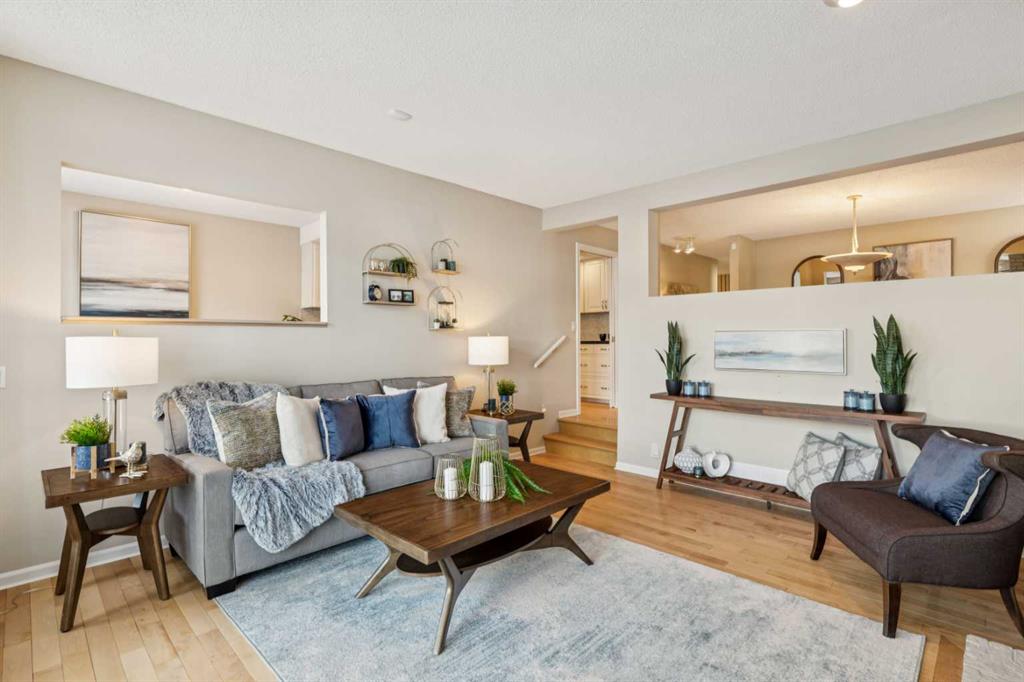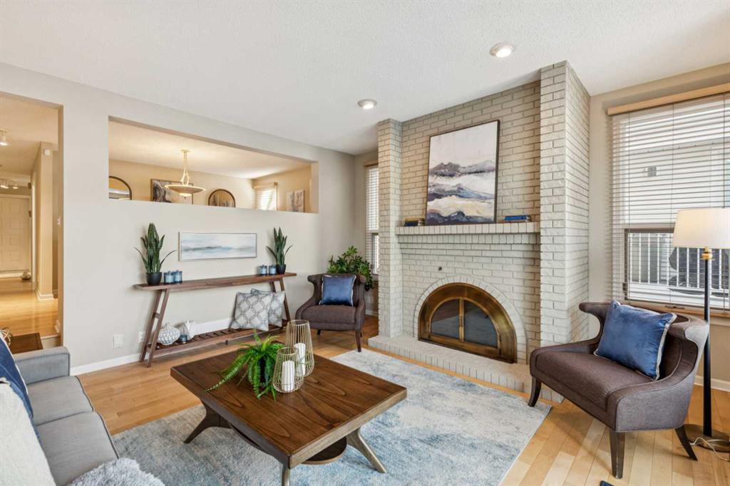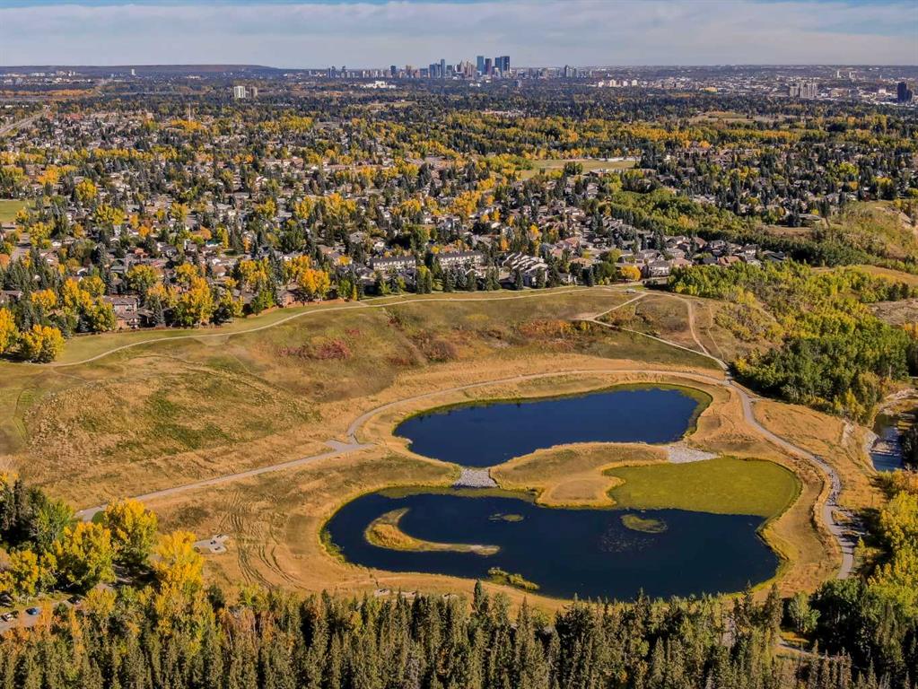 STYLISH, TASTEFULLY RENOVATED TOWNHOME offering 3 BEDROOMS and a MAIN FLOOR DEN plus FINISHED BASEMENT and ATTACHED DOUBLE GARAGE with private driveway that will hold another two cars. AMAZING LOCATION! This complex backs to FISH CREEK PARK and offers easy access to the parks and pathways for outdoor adventures. MANY UPGRADES! New upstairs windows (2022), new furnace (2025), and 2 new hot water tanks (2025), water softener (2025), central air (2022), main floor bath upgraded to a 3-piece, new oven and stovetop in kitchen (2022). Huge primary bedroom has a 5-piece ensuite (jetted tub, separate shower, skylight). This is a home that you really must see!