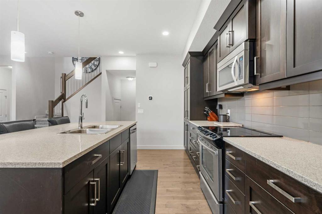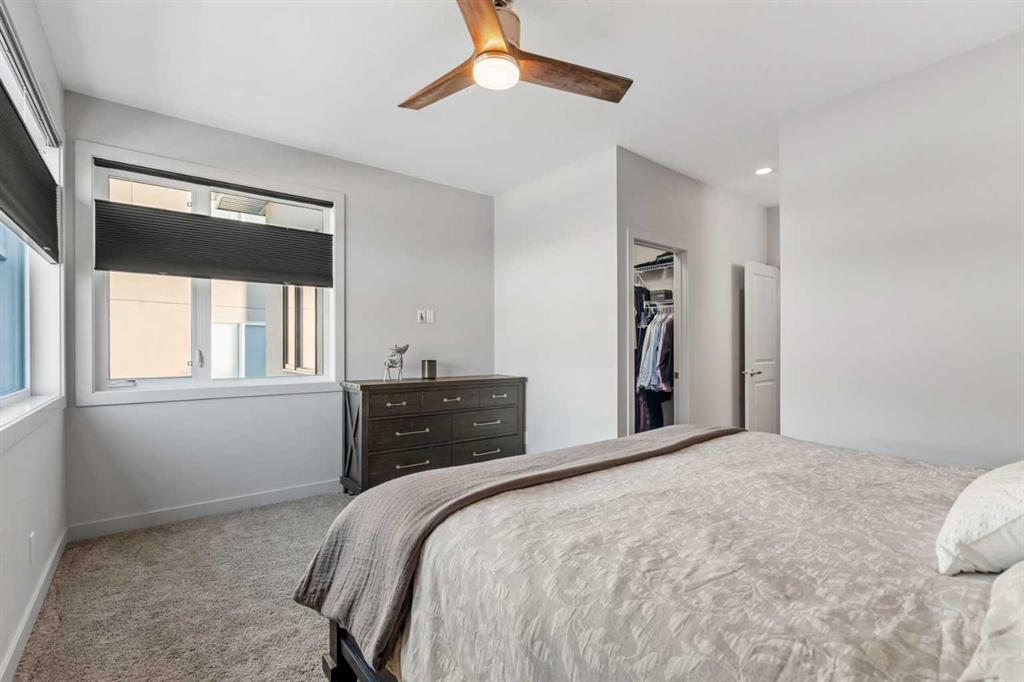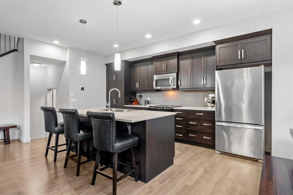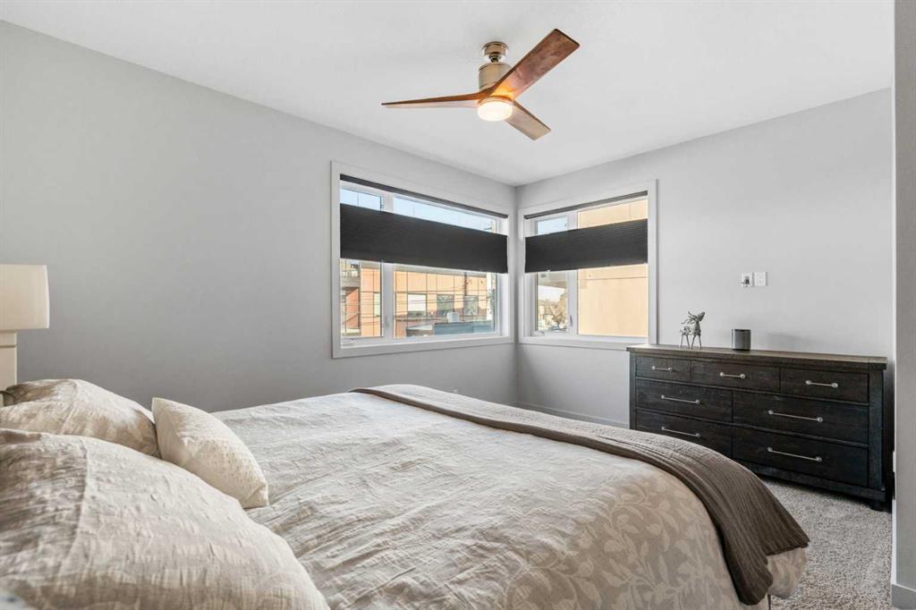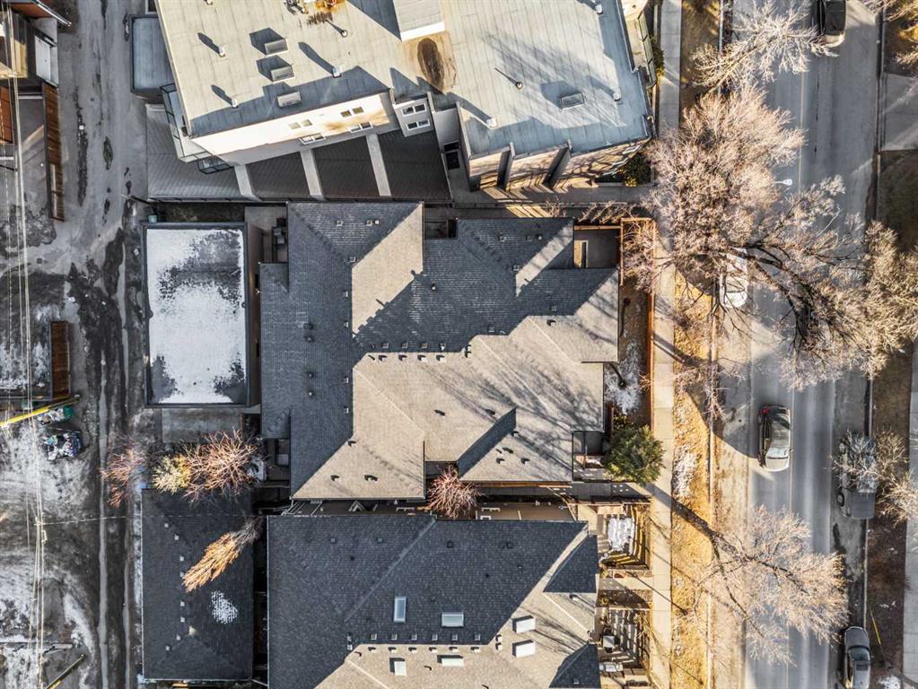 This private northeast-facing residence in an intimate four-unit condo complex, ideally located in the heart of Crescent Heights. Exceptionally well maintained, this attached two-storey home offers a modern, clean design with a comfortable and private feel throughout. A consistent, muted earth-tone palette enhances the cohesive aesthetic across the main and upper levels, complemented by 9’ ceilings on all floors and central A/C. The main level features a spacious open-concept layout ideal for both everyday living and entertaining. The kitchen is the focal point, complete with a centre quartz island with double sink, telescoping faucet, garburator, and generous bar seating. Stainless steel appliances include an electric stove, refrigerator, microwave hood fan, and dishwasher, while soft-close cabinetry provides ample storage. Hardwood flooring flows through the main living areas, and a convenient half bath completes the level. Step outside to the rear deck, equipped with a BBQ gas line and quick access to the detached single-car garage. Upstairs, you’ll find two well-proportioned primary bedrooms, each with walk-in closets and private ensuite bathrooms, creating ideal separation and comfort. Carpet adds warmth to the upper level and staircases, while ceramic tile finishes the ensuite bathrooms. Blackout window blinds are installed throughout, and both ensuites feature upgraded Toto toilets. The lower level offers a full, open, undeveloped basement with painted concrete floors, two oversized windows suitable for future bedrooms, and insulation already in place. Additional upgrades include an ecobee smart thermostat and a Leviton security system with no monthly fees (app-based operation). Located just steps from Crescent Heights’ popular cafes, restaurants, and amenities, and a short bike ride to downtown, this property offers an exceptional blend of low-maintenance living, thoughtful design, and unbeatable inner-city convenience.