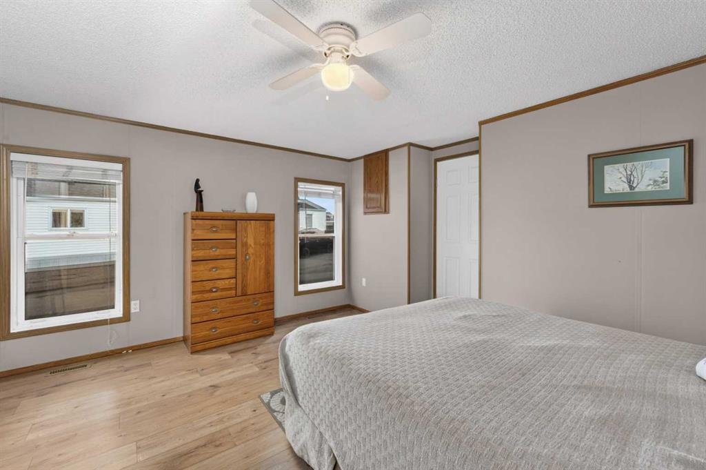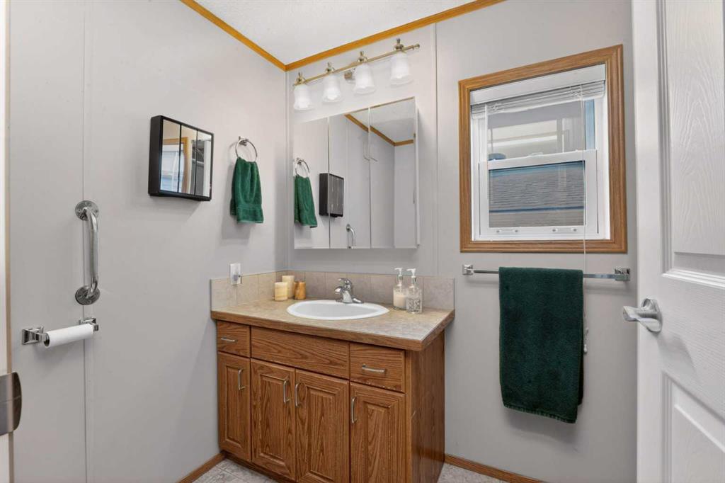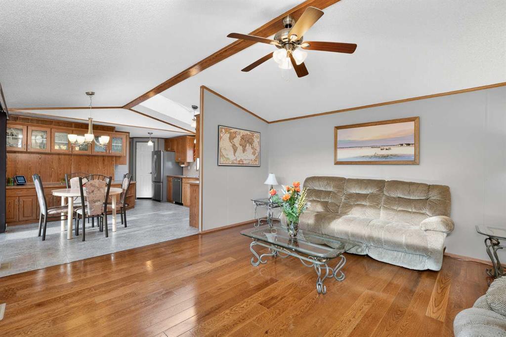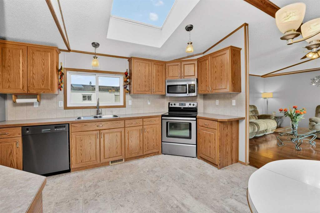Located in Strathmore’s Ranch Estates, a premier adult living community. This well-maintained 3-bedroom, 2 full-bath home, including an ensuite walk-in shower and walk-in closet, offers comfortable, low-maintenance living, with landscaping included in the park fees. The open-concept design features a bright kitchen area with stainless steel appliances and a skylight. It flows seamlessly into an inviting, bright living space accented with hardwood flooring and large windows with shutters—step outside to a spacious west-facing covered deck with rolling shades and a gas BBQ—perfect for entertaining guests. Practical highlights include an insulated garage finished with drywall, an attached workshop, and a 6′ x 8′ garden shed for additional storage. Recent exterior updates include the roof and eavestroughs. Located near many amenities like shopping, restaurants, walking paths and Kinsmen Park—an excellent opportunity for buyers seeking convenience, comfort, and a community-focused lifestyle.