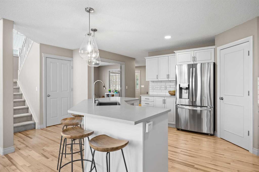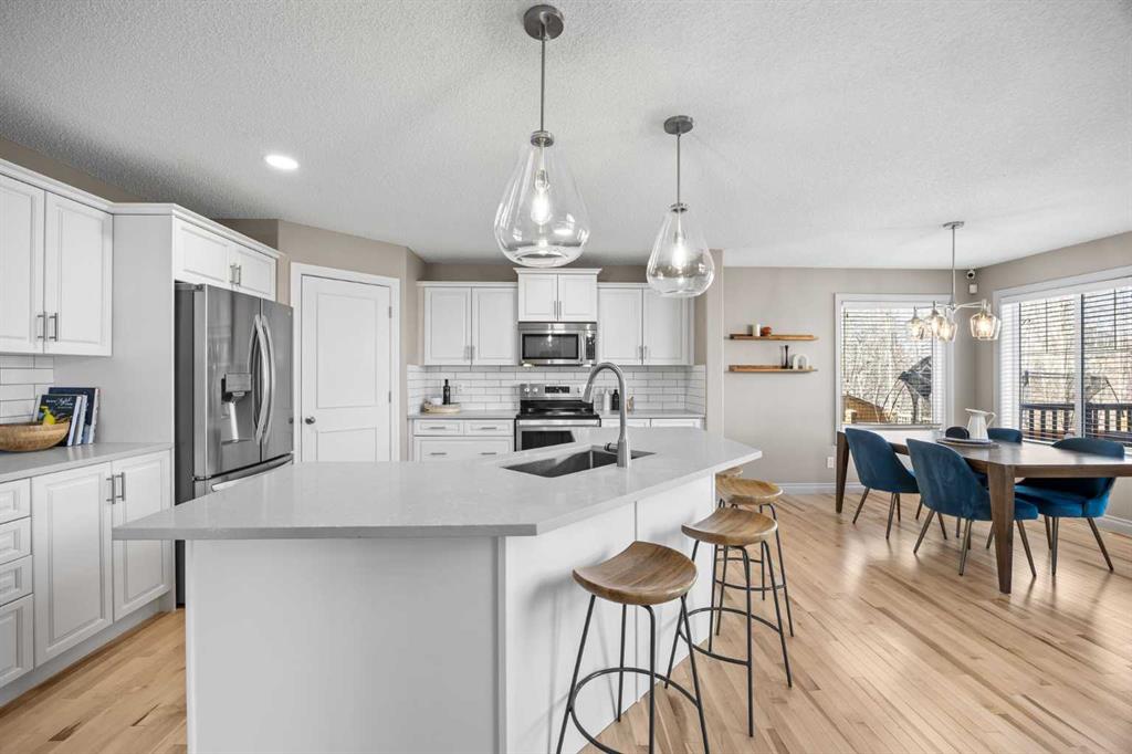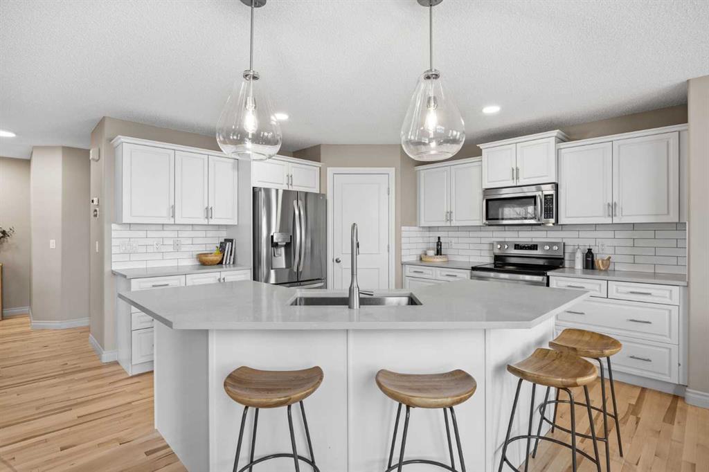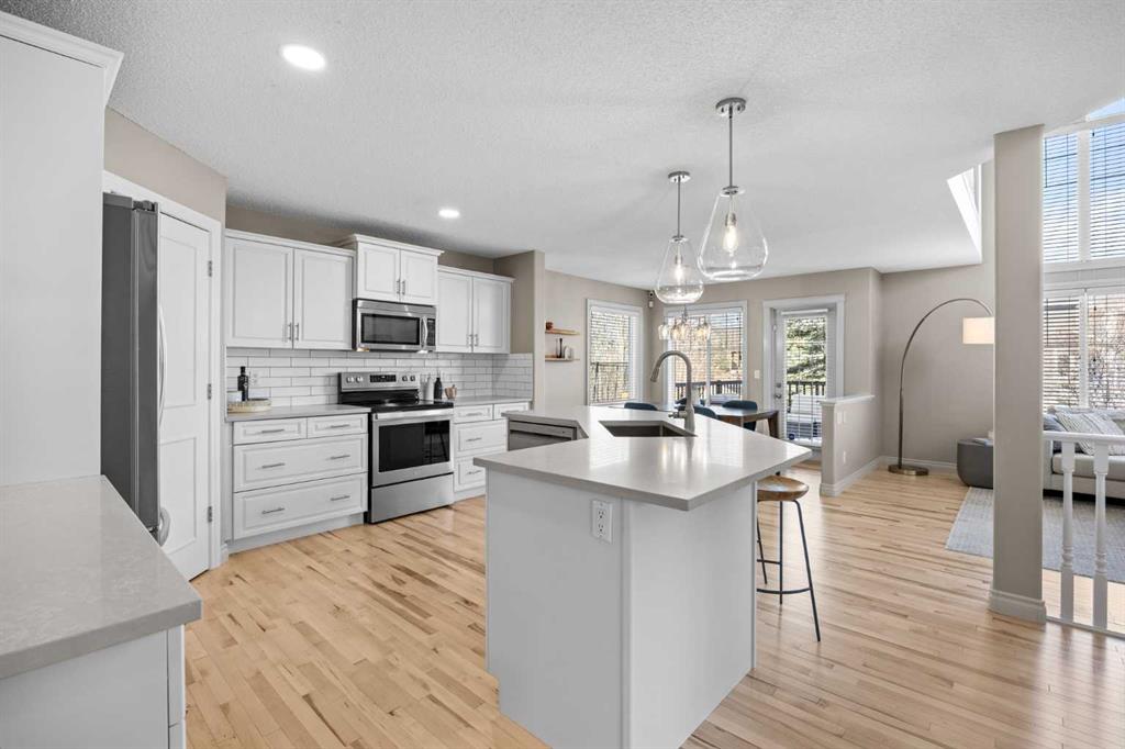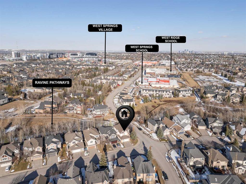 Open House Saturday April 18 & Sunday April 19, 11:30am-1:30pm. This is the family home you have been dreaming of in the cherished community of Wentworth. Backing on to a treed ravine with walking paths brings a sense of peace at home and adventure right outside your doorstep. Nestled on a 47 foot wide corner lot and steps to West Springs (K- Gr 6) and West Ridge (Gr 7-9) schools, this is a location perfect for families. Natural light, an abundance of windows, a vaulted ceiling, gleaming new hardwood flooring, updated light fixtures and a newly renovated kitchen will make you feel at home. A spacious front foyer welcomes you and carries through to a main floor office or flex space, ideal for working from home or a play room right off the kitchen for young ones. The renovated kitchen boasts dreamy stone countertops, designer lighting, stainless steel appliances and a convenient walk-through pantry. Soaring ceilings, expansive windows and a stunning fireplace will have you cozying up in the living room. The upper level offers a bonus room (could be converted to a 4th upper bedroom) and 3 bedrooms including a primary suite with vaulted ceilings and a 5-piece ensuite bathroom. The upstairs bathrooms have been updated as well. Heading to the lower level, you will find a well laid out floorplan fit with a spacious rec space, gym area, 4th bedroom, full bathroom and a mechanical room with built-in storage. It is finished and ready for you to enjoy. Additional upgrades include air conditioning, underground sprinklers, Gemstone Lighting and an oversized garage. With the warmer weather here, the backyard will be a place to relax, unwind and have the kids run around playing. Enjoy the conveniences of being able to walk to nearby amenities, including Co-op, Shoppers, Starbucks and even for a dinner out at Mercato. Wentworth offers ease of access to the Rocky Mountains, a quick commute into downtown as well as around the city via Stoney Trail. Wentworth is known for its friendly neighbours, nearby shopping and dining options and highly regarded schools – West Springs, West Ridge, St. Joan of Arc, Calgary French and International School and many more private school options nearby. All that’s left to say is welcome home.
