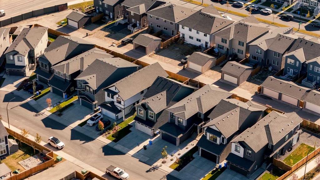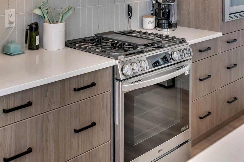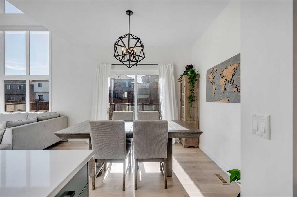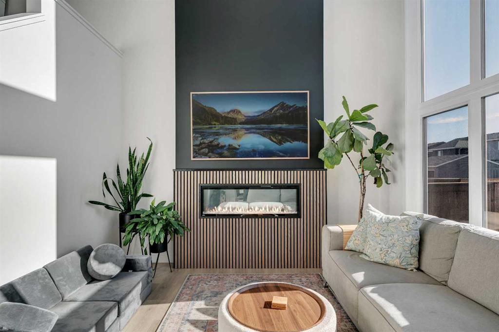 20 Edith Crescent NW in Glacier Ridge offers 4 bedrooms, 3.5 bathrooms, and a layout that works for real life. The main floor is anchored by an 18 foot open to below living room with oversized windows and a statement fireplace. The kitchen is a clear step above the typical spec package with two tone cabinetry to the ceiling, full height tile backsplash, chimney hood fan, gas range, built in microwave, and a large quartz island with seating for four.