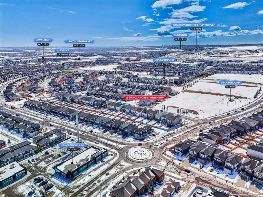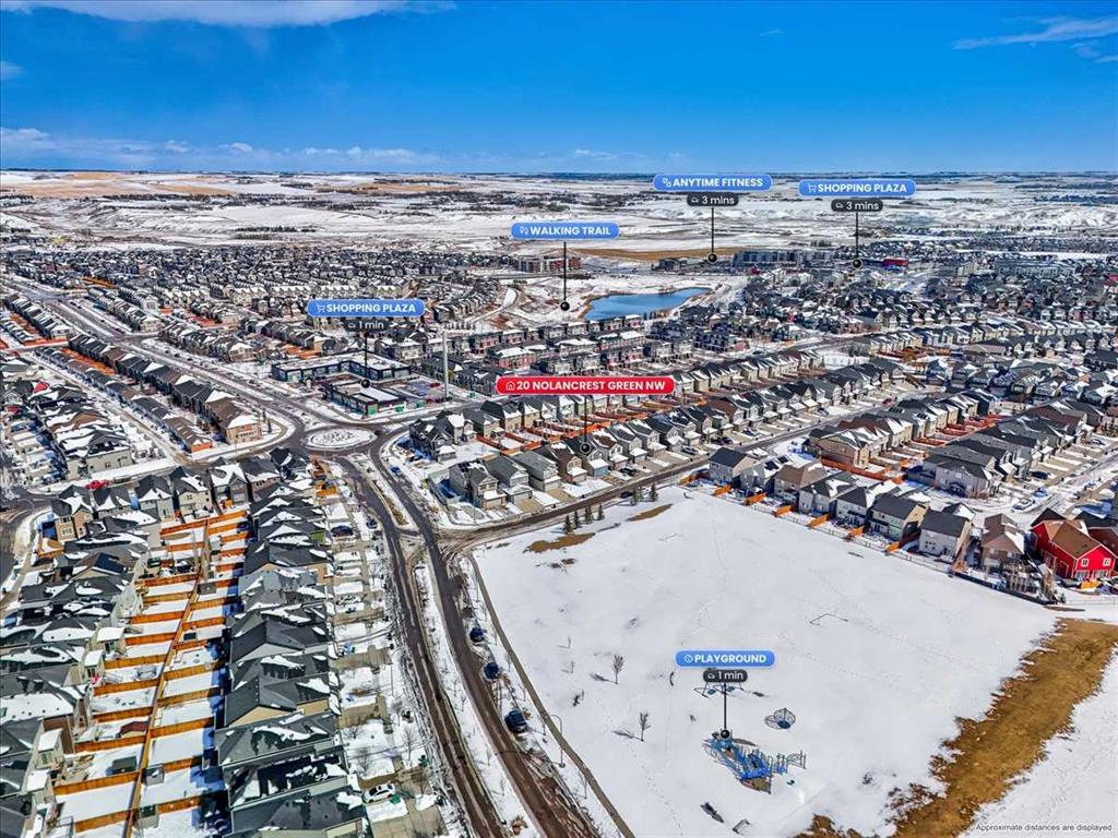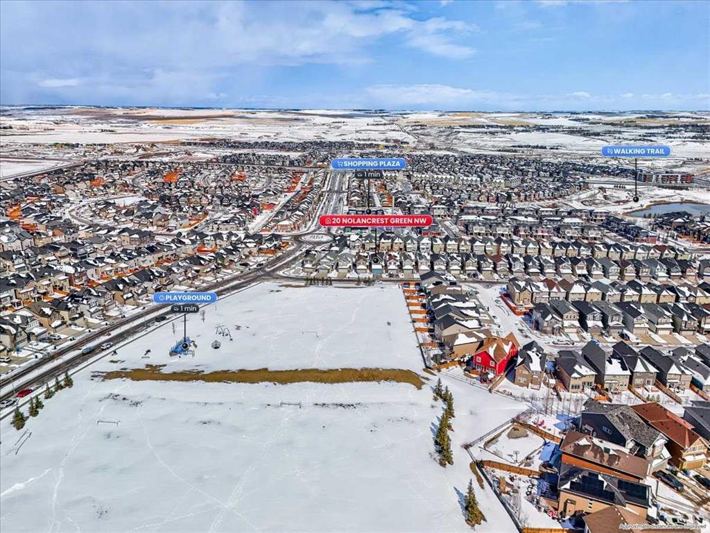 Welcome to 20 Nolancrest Green NW—ideally located on a quiet street overlooking green space with a playground and soccer field, perfect for families and those who value privacy and scenic views. The main floor features built-in cubbies that add both style and practical everyday storage, a bright den/office with French doors – an ideal work-from-home setup, rich hardwood flooring and a spacious open-concept layout that seamlessly blends the living room, dining area, and kitchen. The inviting living room is anchored by a cozy gas fireplace, creating the perfect space to relax or entertain. You’ll also appreciate the 9-foot ceilings, knockdown finish, and abundant lighting throughout. The kitchen is both functional and inviting, complete with a large island and breakfast bar, granite countertops, an undermount sink, a convenient pantry, and a full set of newer appliances (2024), including fridge, dishwasher, and hood fan. Sliding doors lead to an oversized backyard—perfect for outdoor living and entertaining. Upstairs, you’ll find three generously sized bedrooms, a versatile bonus room (easily convertible into a fourth bedroom), and convenient upper-level laundry with newer washer & dryer (both from 2024). The spacious primary suite includes a walk-in closet and a well-appointed ensuite with a jetted tub, separate shower, and dual sinks. The basement is partially finished and includes a permitted 3-piece bathroom, with plenty of room to develop a recreation area, additional bedroom, or storage space. Enjoy easy access to transportation, schools, shopping, grocery stores and all your daily amenities. This home truly offers comfort, space, and an exceptional location Book your private showing with your favorite agent today! ***SEE VIRTUAL TOUR***