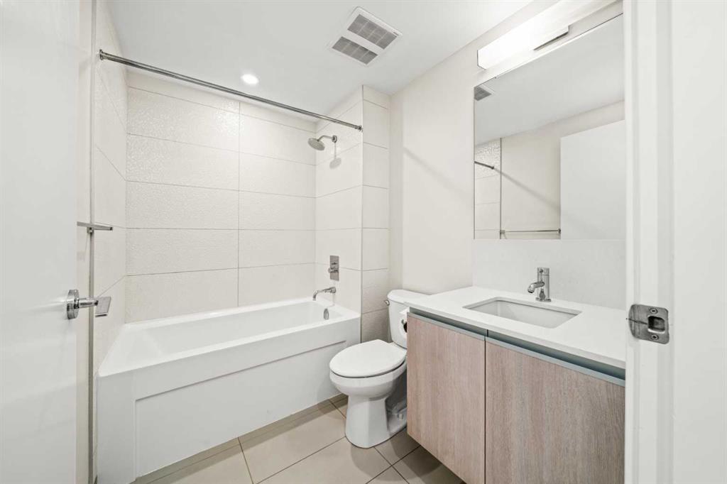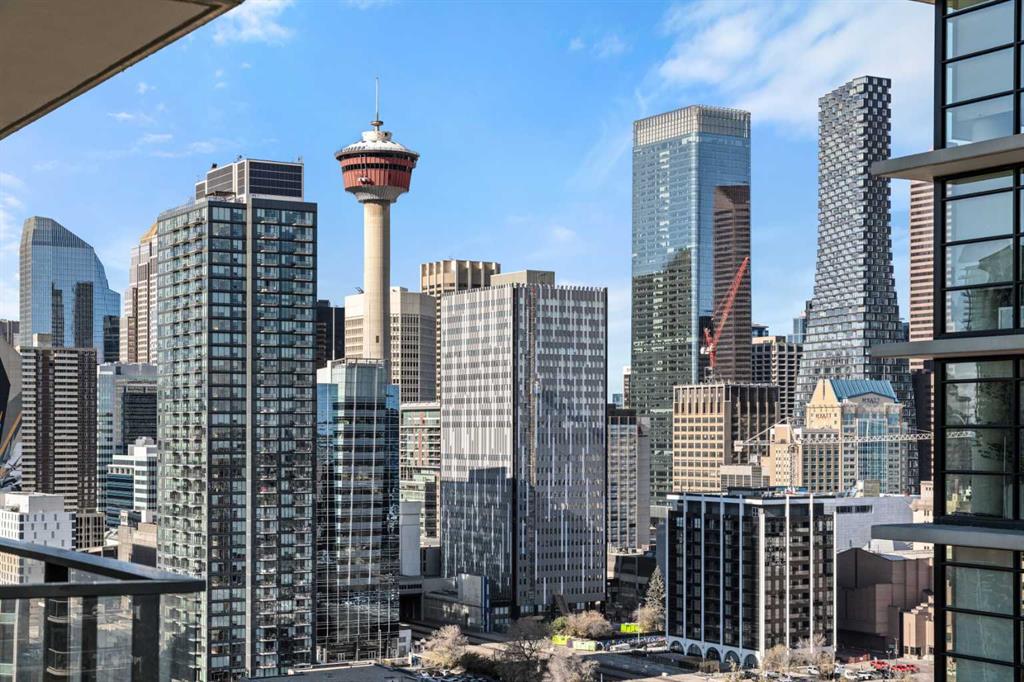 Step out onto the spacious covered balcony and take in vibrant city views and stunning sunsets. Glass railings showcase the Calgary skyline, including the iconic Calgary Tower.