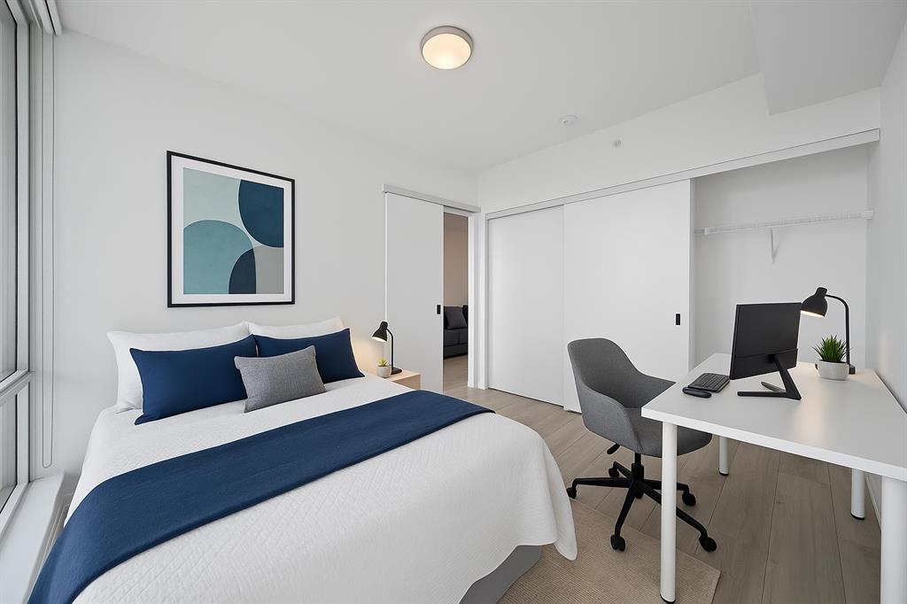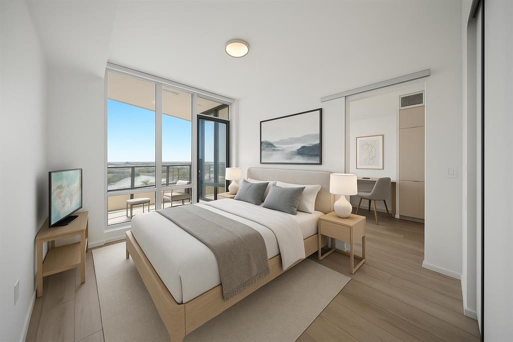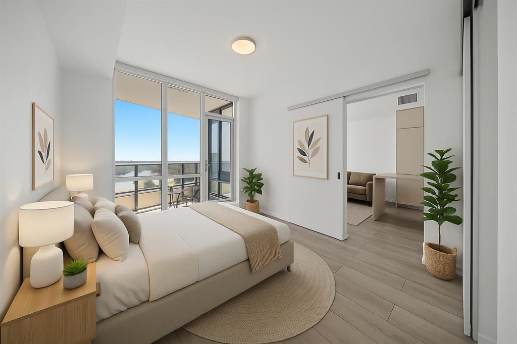 Inside, the layout is one of Verve’s most functional: an enclosed Den with a sliding door that works as a true office or comfortably fits a twin bed, offering rare versatility for guests, hybrid work, or extra income potential. The modern kitchen features quartz countertops, stainless steel appliances, and a large island with seating. Floor-to-ceiling windows maximize natural light, while central A/C, in-suite laundry, and a private balcony add everyday comfort.