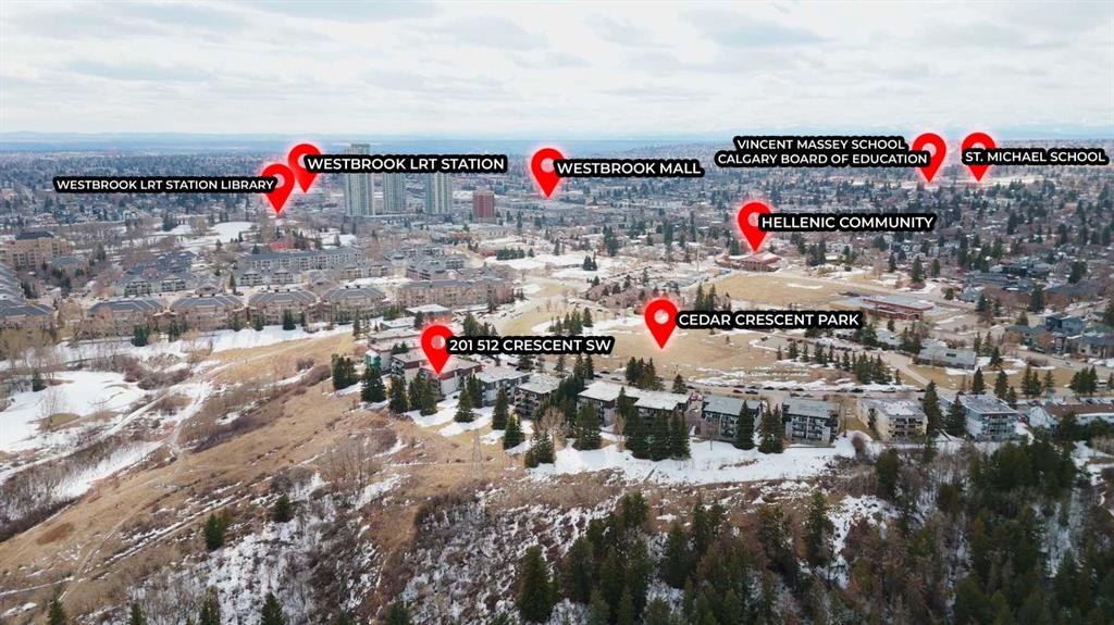 Open House! Sunday, April 12th, 2026, from 1:00 PM to 4:30 PM. Experience the perfect blend of city living in quiet natural surroundings – Welcome home to 201 – 512 Cedar Crescent SW! Featuring a prime location in the quiet community of Spruce Cliff, this home offers unobstructed views of the Downtown Calgary skyline and the river valley. This spacious 3-bedroom 2-bathroom condo showcases over 1000 square feet of living space – perfect for your evolving needs. The interior displays custom wood detailing and updated windows that flood the space with natural light. The heart of the home is the living area, anchored by an impressive wood-burning fireplace with custom mantel & oversized sliding patio doors out onto the private balcony. The galley-style kitchen offers ample storage & newer appliances. The primary bedroom features a 3-piece ensuite bathroom with walk-in shower. Two additional bedrooms and main 3-piece bathroom with walk-in shower complete the unit. The amazing Spruce Cliff location makes getting around the city a breeze – just a 5 minute drive to downtown, easy access to the mountains, blocks to Westbrook Mall/C-train/local amenities, and steps to Edworthy Park/Pathways & the Bow River. Book your viewing today!
