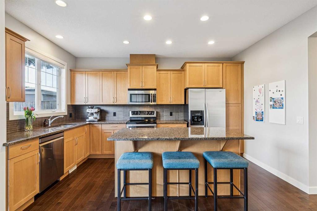 POPULAR ALTADORE! Situated on a rare 131-foot extra-deep lot and offering more than 2700 sq ft of living space, this move-in ready home has so much to offer. The bright, south-facing front fills the main floor with natural light, highlighting the hardwood floors and 9’ ceilings throughout. At the front of the home, the sunny living room with a cozy gas fireplace creates a welcoming space to relax, while the adjoining dining area easily accommodates a large table for family meals and entertaining, complete with built-in cupboards and a versatile counter or desk area. The kitchen balances function and style with granite countertops, a central island with seating, stainless steel appliances, and a pantry for added storage. A practical rear mudroom provides an ideal drop zone when entering from the garage, and a convenient 2-piece bath completes the main level. Wrought iron railings lead upstairs to three generously sized bedrooms, including a spacious primary retreat featuring a large walk-in closet and a well-appointed 5-piece ensuite with dual sinks, a soaker tub, and separate shower. A full main bath and an oversized upper laundry room with sink and cabinetry add everyday convenience. The fully finished basement expands your living space with two additional bedrooms, a full bathroom, a large family room, flexible bonus space, and plenty of storage. Outside, the extra-large backyard is perfect for low-maintenance enjoyment with artificial turf, a stamped concrete patio, and a gas BBQ line for easy summer grilling, all surrounded by mature trees that add privacy and charm. The deeper-than-average 22’ x 20’ double garage comfortably fits a full-size truck and is accessed from a paved back lane. Located just steps from schools, parks including River Park, transit, and major routes, this home offers an exceptionally convenient lifestyle in one of Calgary’s most desirable communities. Call your favorite Realtor to book a private showing!