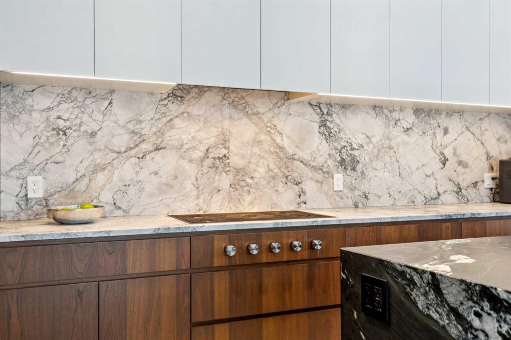 A rare opportunity to own a Bioi-designed architectural residence, featured in Western Living + specifically crafted for modern indoor-outdoor living. Extraordinary natural light, anchored by a striking two-storey light well and a private south-facing backyard on a quiet street. Dramatic sunken living room with interior brick, walnut millwork + a concrete ribbon fireplace with hidden TV + integrated cabinetry. Full-height glazing brings outstanding natural light, complemented by large-format ceramic flooring + rich walnut detailing throughout. Kitchen: integrated appliances, expansive island, Sub-Zero wine fridge, Wolf appliances + soapstone and marble counters. Office: 12-foot ceilings, floor-to-ceiling windows, automated blinds, pocket reeded glass door + custom walnut built-ins. Upstairs: three bedrooms including children’s rooms with built-in desks, plus a serene primary retreat with built-in closet system + a skylit shower. Lower level: bright two-storey west light well, large playroom, generous storage + an additional bedroom with full-height window. Outdoor living: south-facing, fully landscaped yard with a striking cantilever creating a covered concrete patio lounge with outdoor kitchen, firepit, + irrigation for easy maintenance + two custom steel garden beds. Comfort + efficiency: radiant heat, air conditioning, upgraded natural wool carpet, electric vehicle charging ready + European tilt and turn windows. Double garage + a spacious exterior gym. Walk to the Glemore Reservoir pathway system, River Park, tennis, pool + arenas.