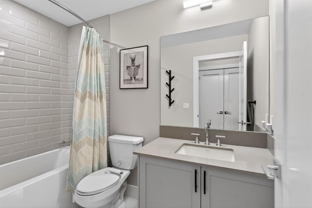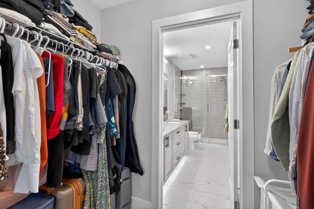 The primary bedroom includes a spa-inspired ensuite with double vanities & a large subway-tiled shower. The second bedroom is located on the opposite side of the unit with a full 4-piece bathroom, making it ideal for guests, roommates, or a home office.