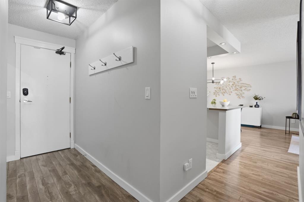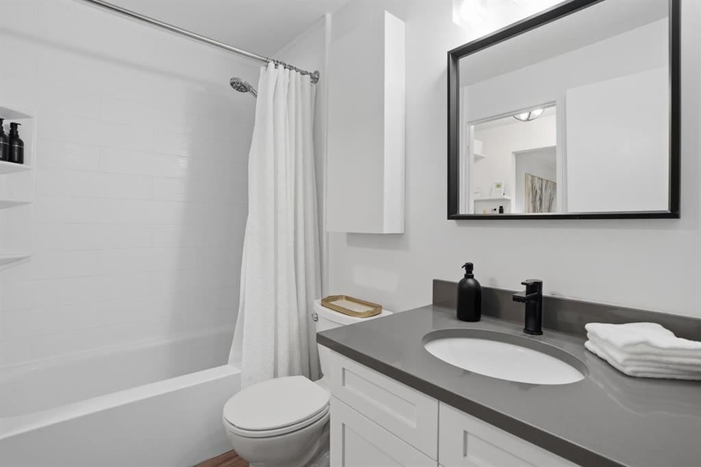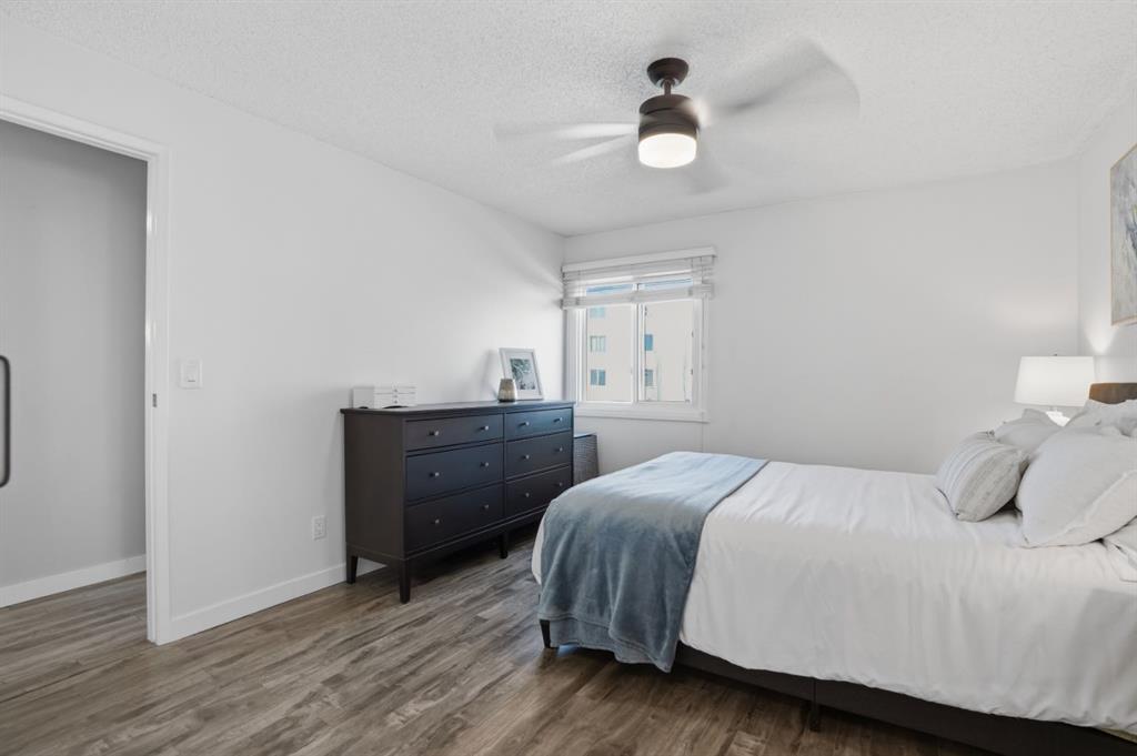 The open-concept layout is light and airy from the moment you walk in. The white kitchen is the heart of the space, featuring stone countertops, white tile backsplash, stainless steel appliances, and updated light fixtures that give the whole unit a fresh, modern feel. There is plenty of counter space for cooking and enough room to actually enjoy the kitchen. The slat wall feature in the living room adds warmth and character without being overdone, and the natural light that moves through the space all day makes every room feel spacious. Step outside to your west-facing balcony and you have a genuine spot to exhale. Afternoon sun, fresh air, and a view that reminds you why you chose inner-city living in the first place. Whether it is morning coffee or an evening wind-down, this balcony gives you dedicated outdoor space.