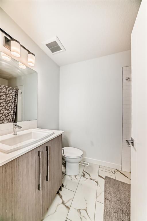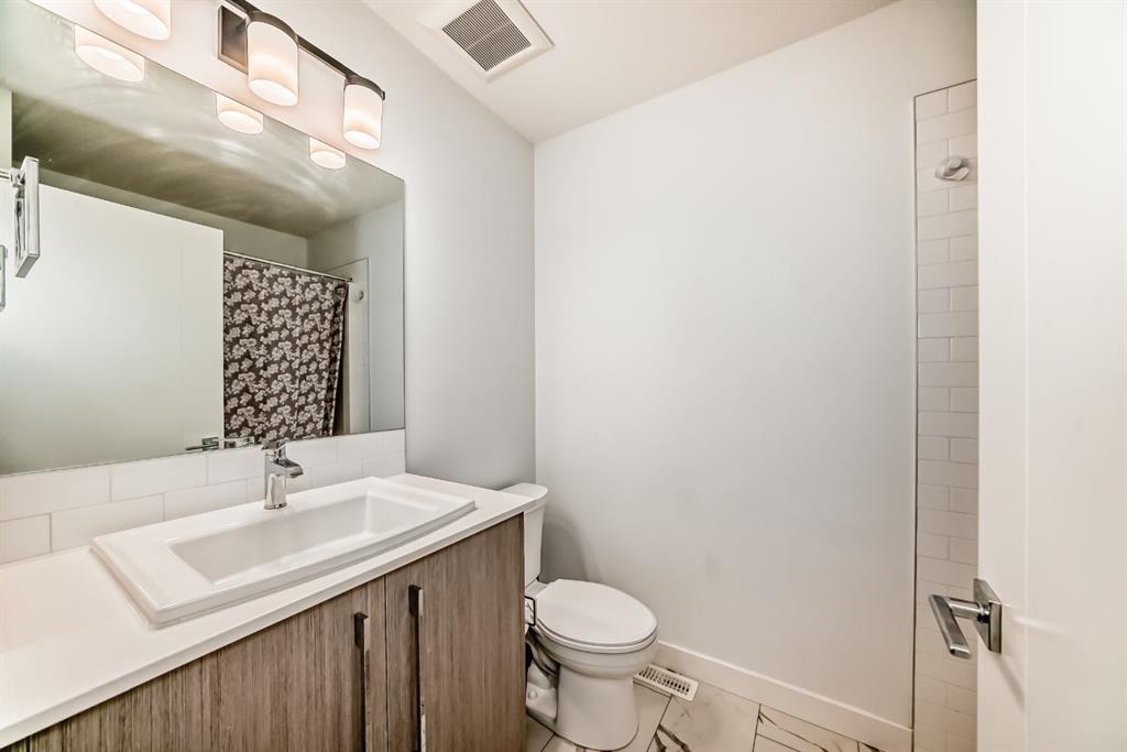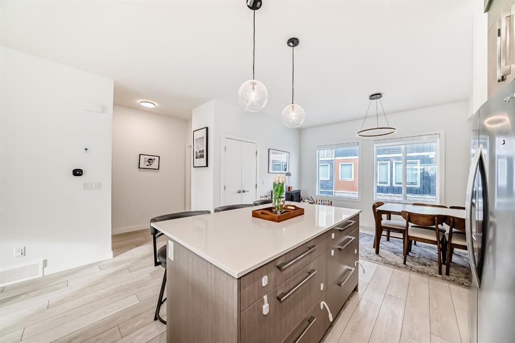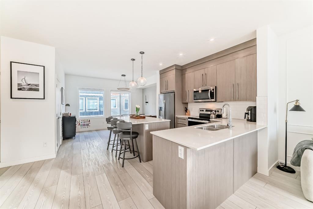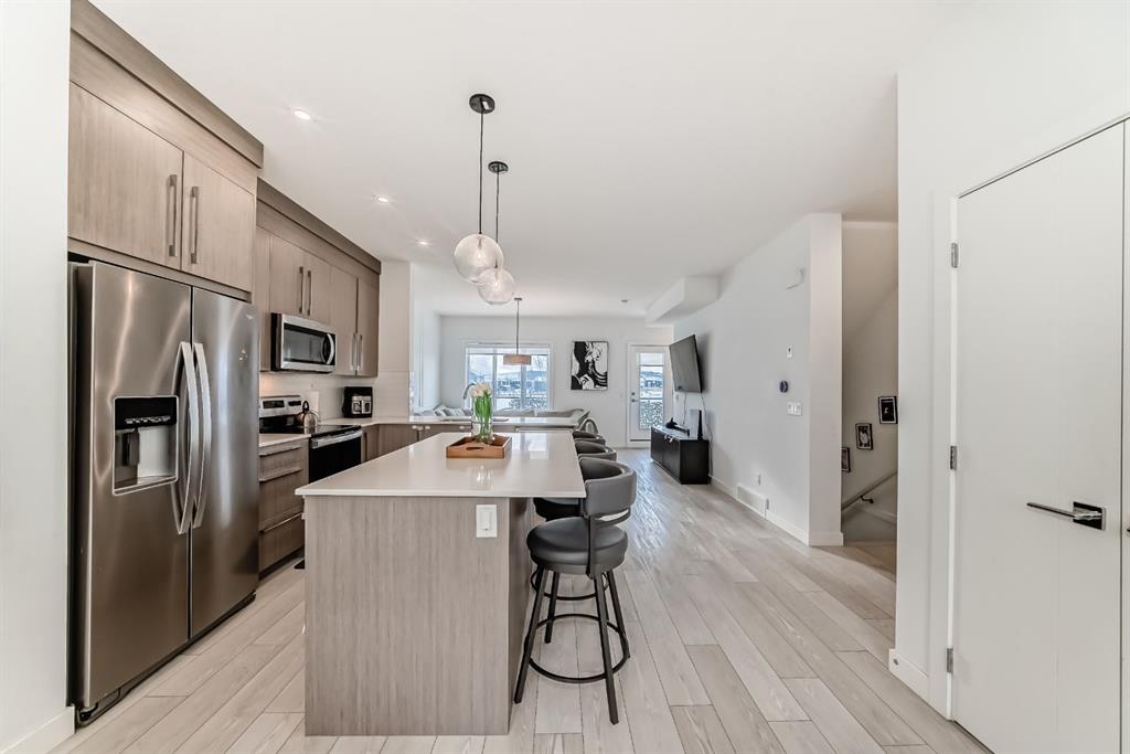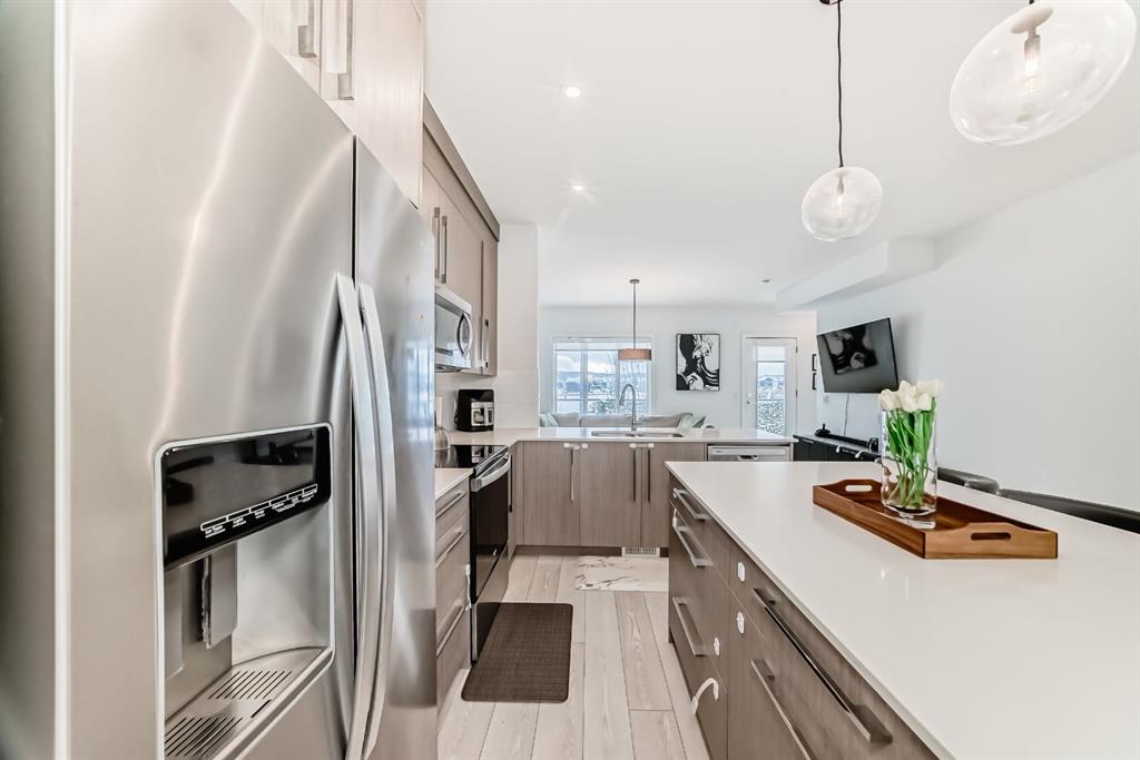 BEAUTIFUL 4 Bedroom townhome! Upon entering this bright and sunny townhome you will be impressed with the functional layout and neutral colour palette. The main level features open concept kitchen/living/dining with luxury vinyl plank flooring, quartz countertops, high ceilings and a powder room-tucked away. Pantry, large balcony with a view of the mountains are just a couple more features of your main living space. Retreat upstairs to your primary bedroom with tray ceiling, walk in closet and 4 piece ensuite bathroom. 2 more good sized rooms, laundry and full bathroom complete this level. The ground level features a rare 4th bedroom, and did I mention a double attached garage?! All located in the community of Pinecreek, close to shopping and parks.