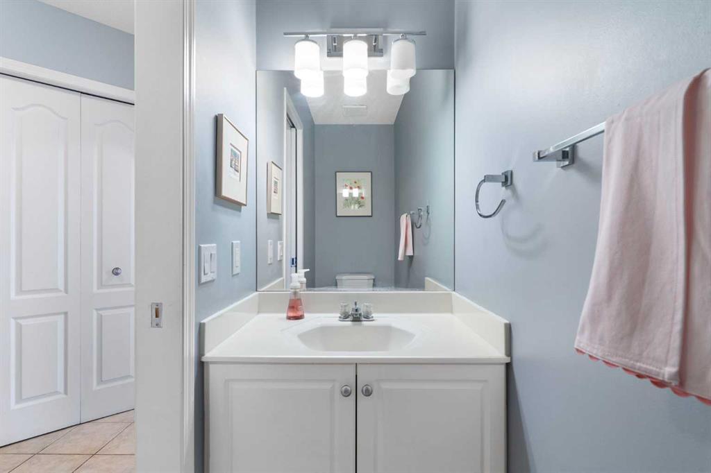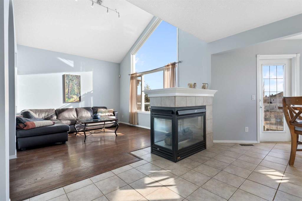 The main floor is thoughtfully designed for both everyday living and entertaining. The well-appointed kitchen offers ample cabinetry and counter space, stainless steel appliances, a pantry, and a central island with seating. It opens seamlessly to the nook and family room, where a shared gas fireplace creates a warm, inviting atmosphere. Step outside to your south-facing Duradek balcony and enjoy stunning mountain views. A den/home office, 2-piece bathroom, and mudroom with laundry complete this level.