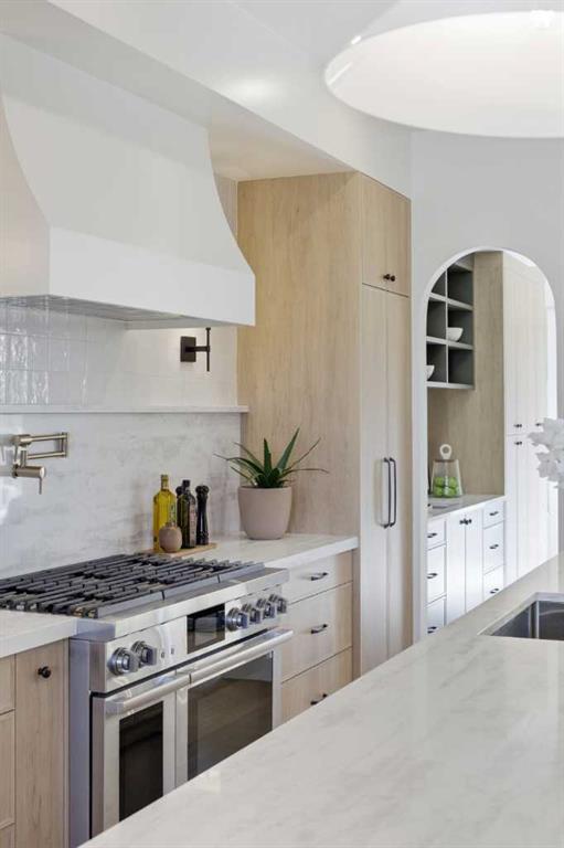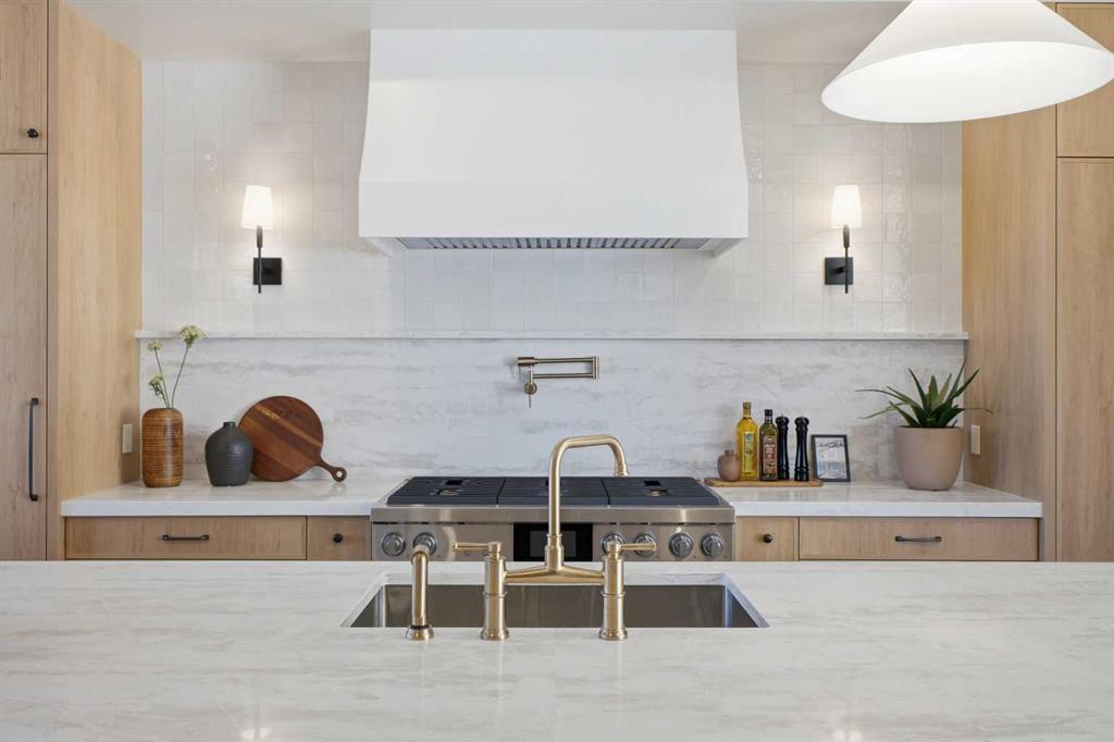 (3.) The Kitchen Is Where You’ll Actually Want to Spend Time: A 14-foot quartz island that’s equal parts functional and sculptural. Premium oversized appliances, pot filler, spice racks, open shelving. And the custom hood fan with a quartz backsplash, aesthetic shelf, and zellige tile up to the ceiling. It’s the kind of detail you don’t see anywhere else.
