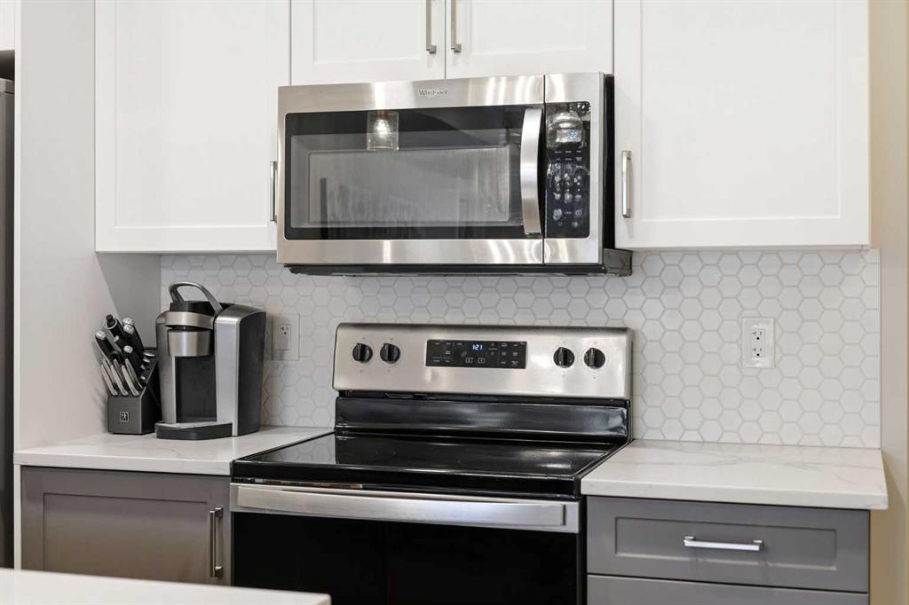 Quality finishes that hold up. Quartz counters, wide-plank floors, stainless appliances. Nothing cheap or flimsy. Kitchen has a functional layout with a proper eating bar.