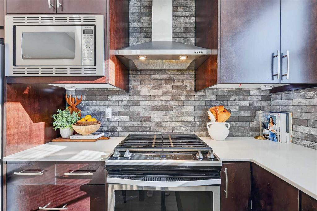 At the center of the home is an upgraded kitchen built for both function and style, featuring stainless steel appliances including a fridge, gas stove, microwave, hood fan, and dishwasher. The layout provides excellent prep space and keeps the kitchen connected to the rest of the living area — ideal for entertaining or relaxed evenings at home.