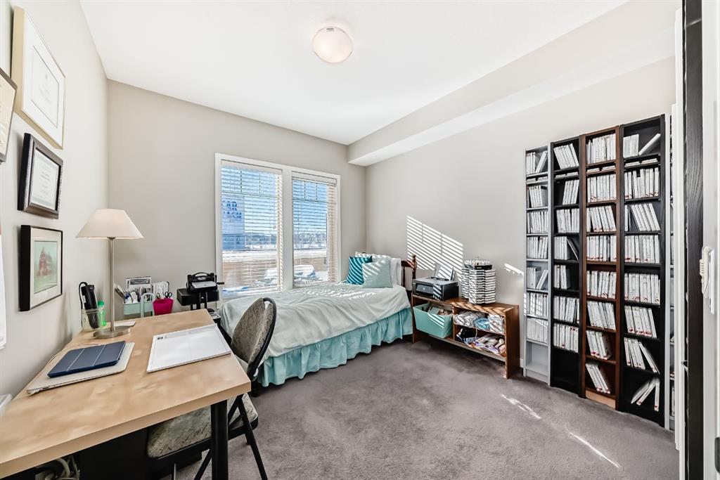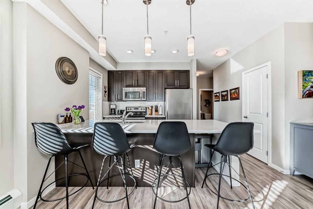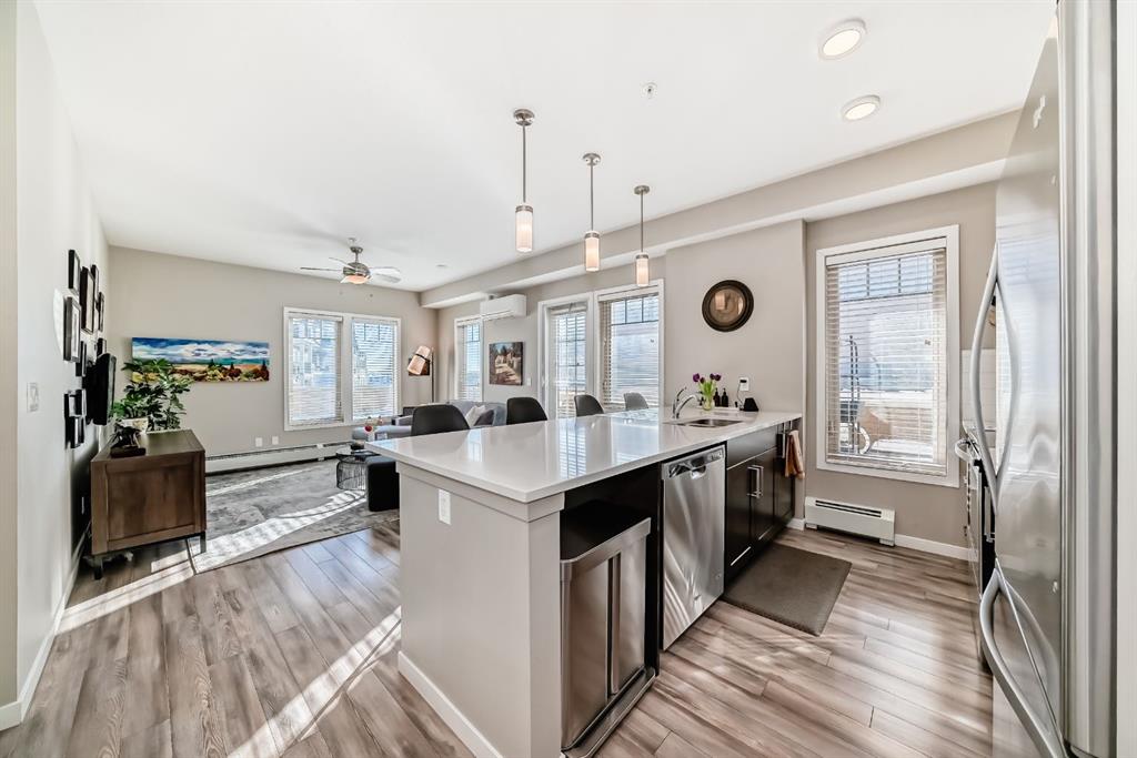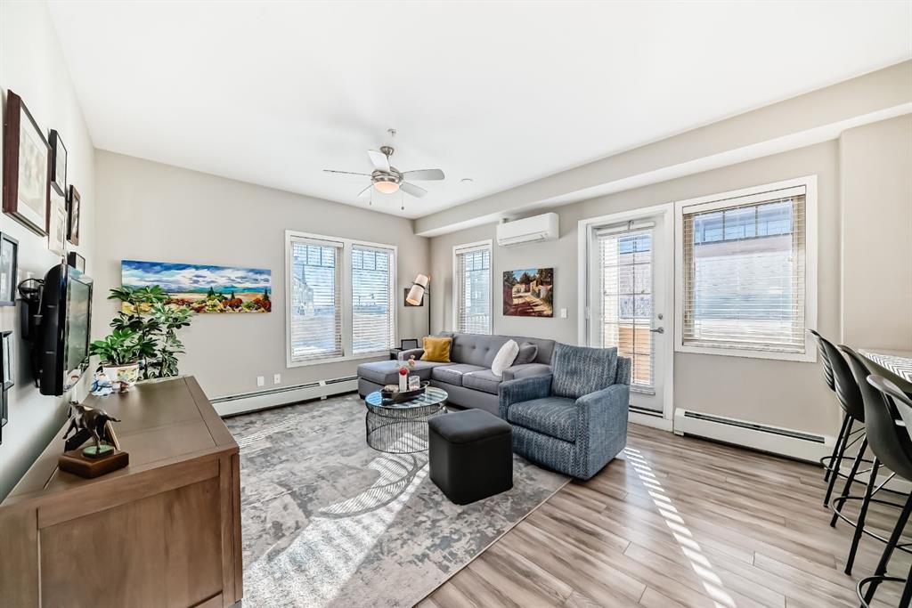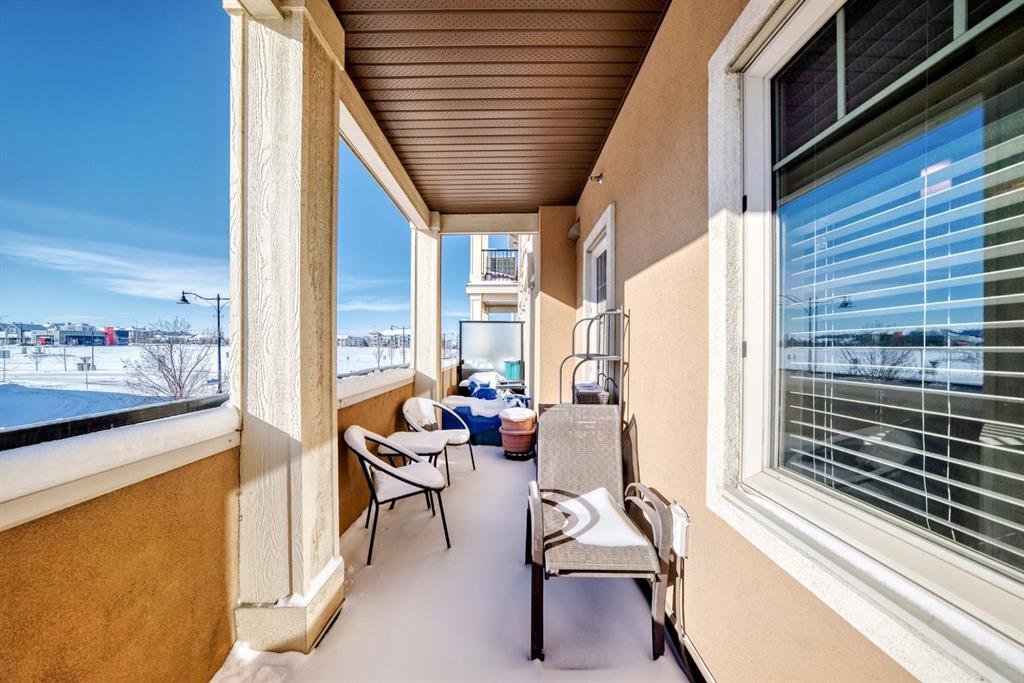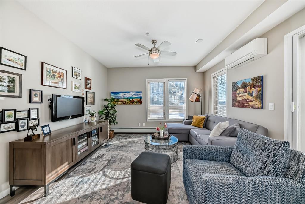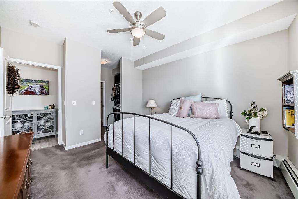 OPEN HOUSE SATURDAY, FEBRUARY 28 1:00–3:00PM. Welcome to this beautifully maintained 2 bedroom, 2 bathroom corner unit in an unbeatable location. With desirable south facing exposure, this home is filled with natural light throughout the day, creating a warm and inviting atmosphere. The thoughtfully designed layout offers a rare hallway entrance that opens into a bright, open concept living space, creating both privacy and flow. A front entry closet and two additional pantry closets provide exceptional storage, while in unit laundry adds everyday convenience. The primary bedroom features built in shelving within the walk in closet and a private 3 piece ensuite bathroom. Stainless steel appliances were updated in 2019, and air conditioning keeps the space comfortable during the summer months, making this home truly move in ready. Step outside onto the impressive 36 foot south facing balcony with mountain views, an ideal extension of your living space to enjoy a quiet morning coffee or relax in the evening sun. Additional highlights include heated underground parking with a storage locker conveniently located directly in front of the stall, stairwell access just outside the unit, and a private gym within the building. Situated in a vibrant, amenity rich community with shops, dining, schools, and everyday essentials within walking distance, this is condo living at its best. Don’t forget that you will have lake access all year round for swimming and skating! A wonderful opportunity to own in a highly sought after neighbourhood.