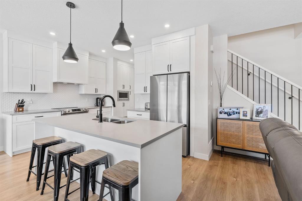 The kitchen is the heart of the home—functional, stylish, and built to gather. Highlights include a quartz island overlooking the living space, ceiling-height shaker cabinetry, stainless steel appliances, a built-in pantry with microwave, and upgraded lighting throughout.