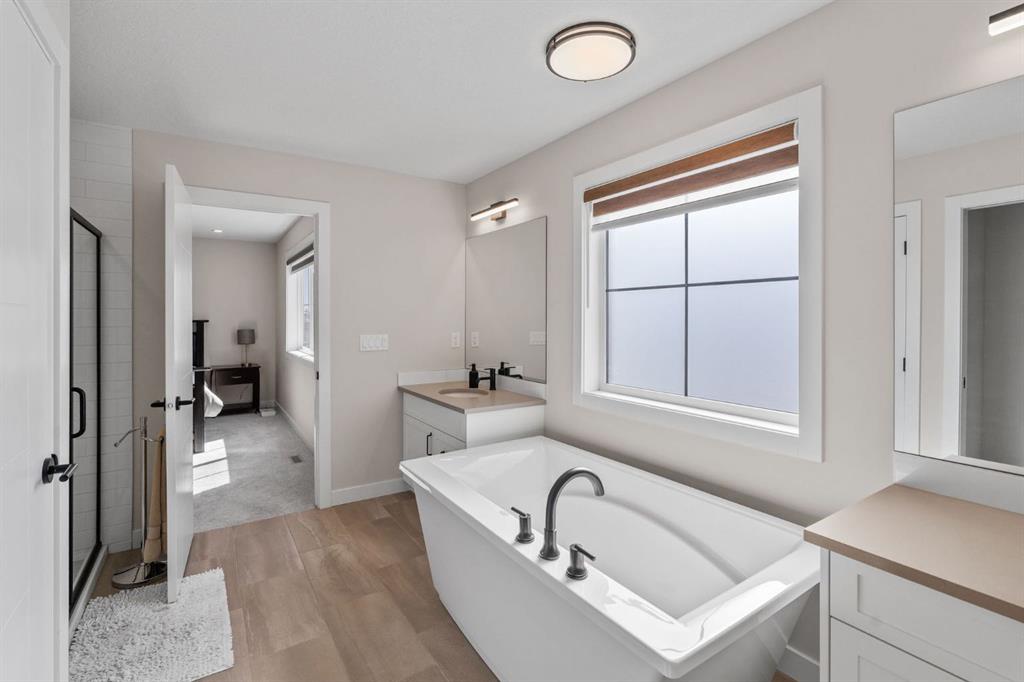 Upstairs, the primary suite is a true retreat with a walk-in closet and a spa-inspired 5-piece ensuite featuring dual vanities, a soaker tub, and a standalone shower. A spacious bonus room offers flexible space for movie nights, a home office, or kids’ zone. Two additional full-sized bedrooms, a 4-piece bathroom, and an upper-level laundry room complete this level.