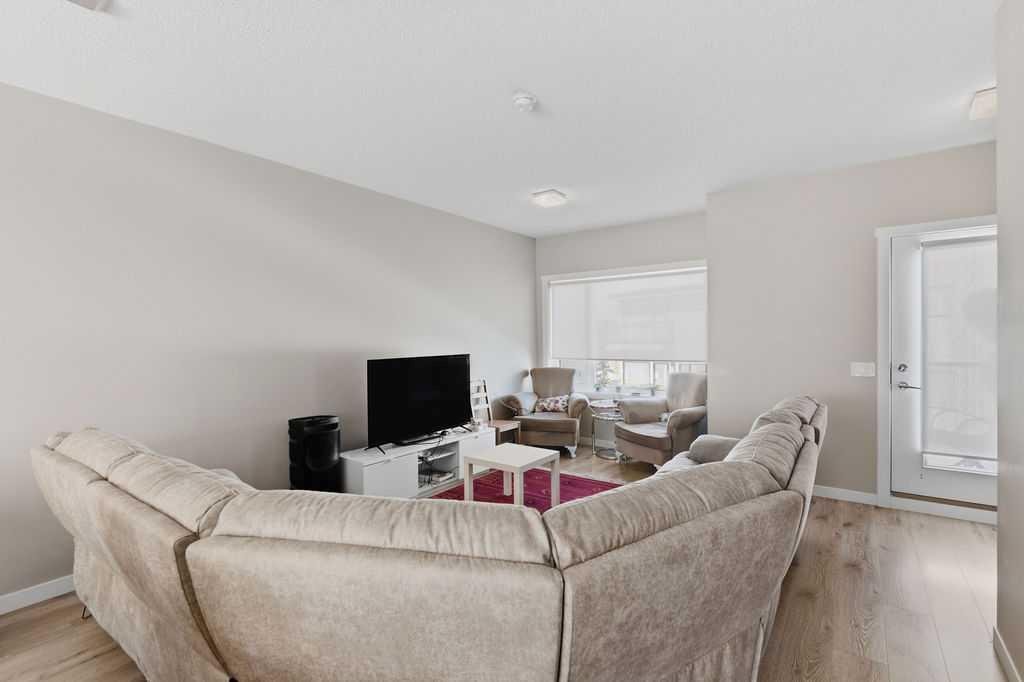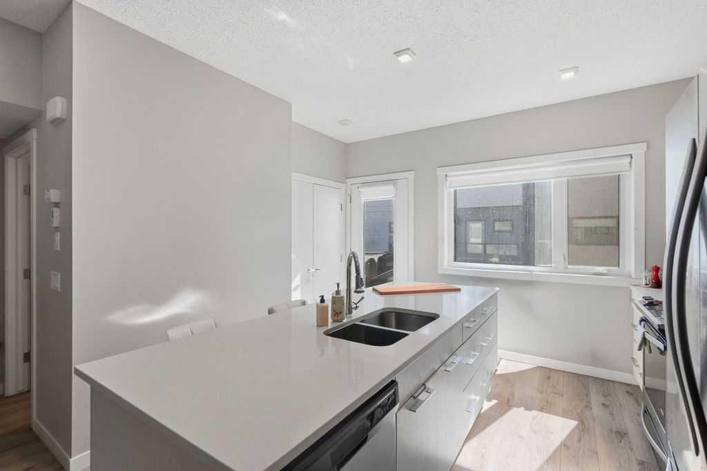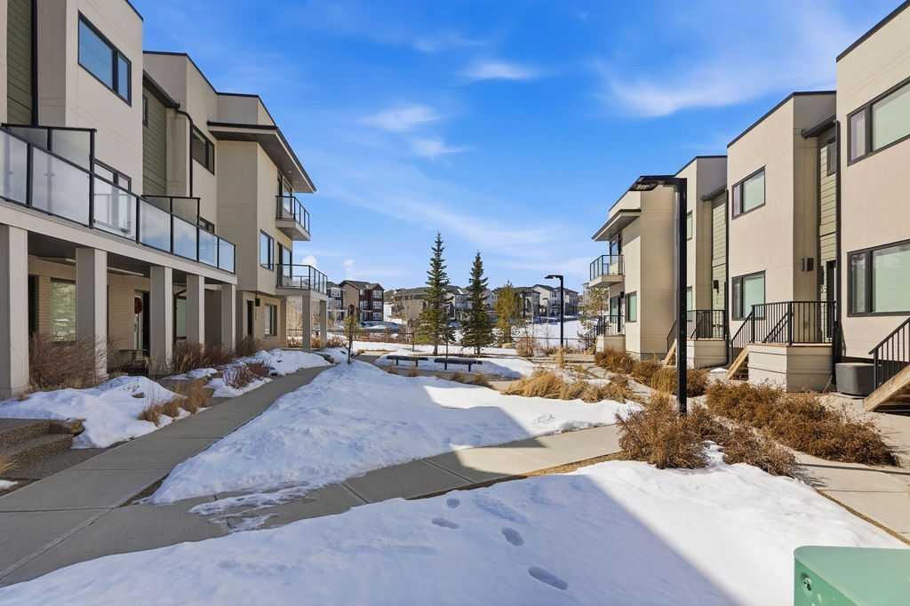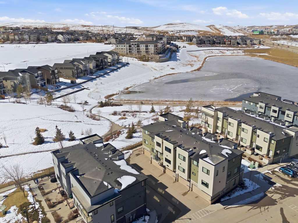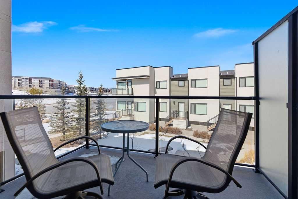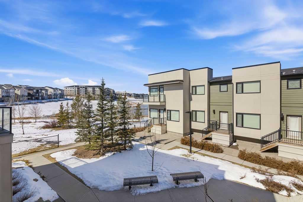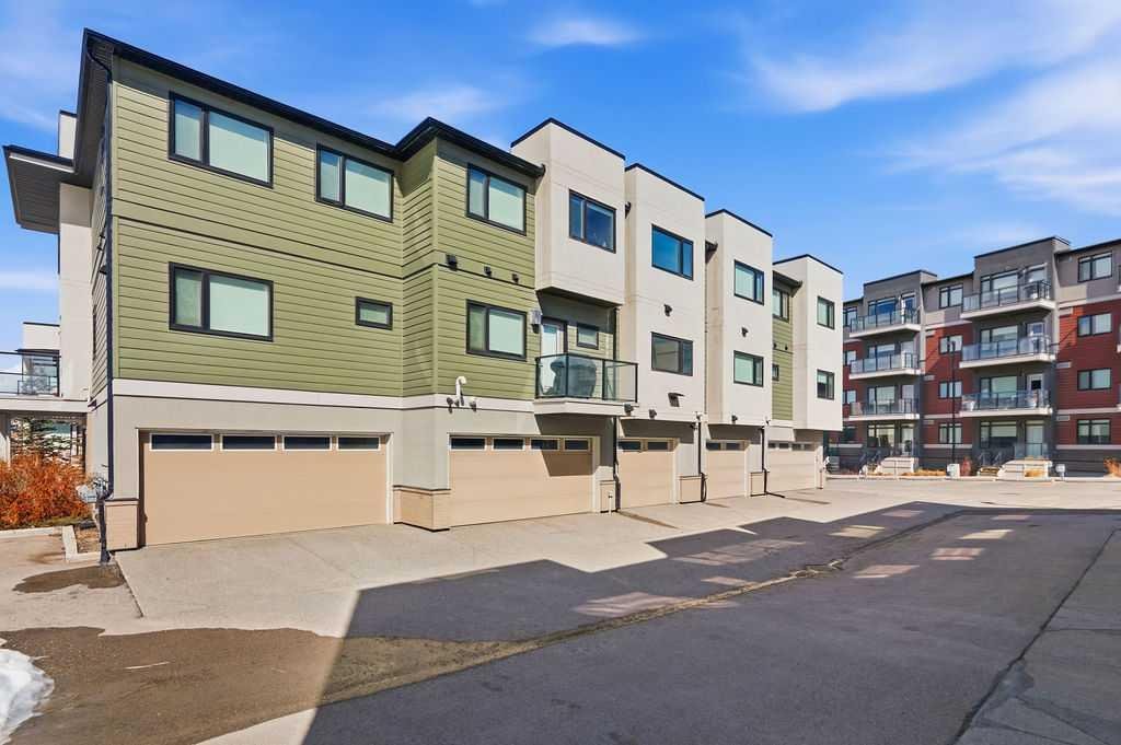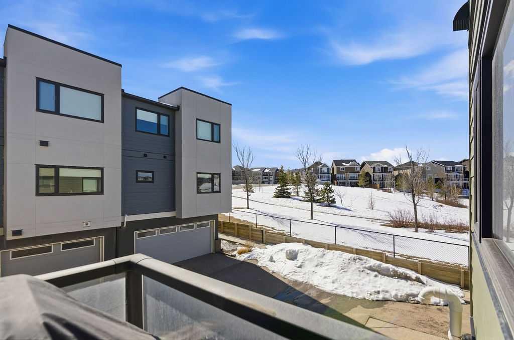 Welcome to this stunning and beautifully appointed townhome in the highly desirable Diseno community of Sherwood. Offering 1,576 sq. ft. of thoughtfully designed living space, this home seamlessly blends modern style, comfort, and functionality—ideal for families, professionals, or those seeking low-maintenance living without compromise. The main level welcomes you with a bright and spacious flex room, perfectly suited for a home office, gym, or guest space. Large windows fill the area with natural light while showcasing peaceful views of the surrounding greenspace, creating an inviting and versatile environment. This level also provides convenient access to the double attached garage, making everyday living effortless. Upstairs, the second level reveals an impressive open-concept layout designed for both relaxing and entertaining. The spacious living room is anchored by natural sunlight, creating a warm and welcoming atmosphere. The adjacent dining area flows seamlessly into the contemporary kitchen, which is sure to impress with its sleek quartz countertops, stainless steel appliances, modern cabinetry, stylish backsplash, and a large island with breakfast bar seating—perfect for casual dining or hosting guests. A standout feature of this home is the presence of two private balconies—one off the living room and another off the kitchen—both offering tranquil pond and greenspace views. These outdoor spaces provide the perfect setting to enjoy your morning coffee or unwind in the evening. The upper level is thoughtfully laid out to maximize comfort and privacy. The spacious primary bedroom serves as a relaxing retreat, complete with a walk-in closet and a private 3-piece ensuite with a stand-up shower. Two additional generously sized bedrooms offer flexibility for family, guests, or workspace, and are complemented by a full 4-piece bathroom. Convenient in-suite laundry on this level adds to the home’s overall practicality. Situated in the sought-after community of Sherwood, this home offers exceptional access to nearby amenities, including Beacon Hill and Sage Hill shopping centres, schools, public transit, parks, and an extensive network of walking paths. With quick access to major roadways, commuting is simple and efficient. Combining a functional layout, modern finishes, beautiful views, and a prime location, this exceptional townhome presents a rare opportunity to enjoy elevated living in one of NW Calgary’s most desirable communities.