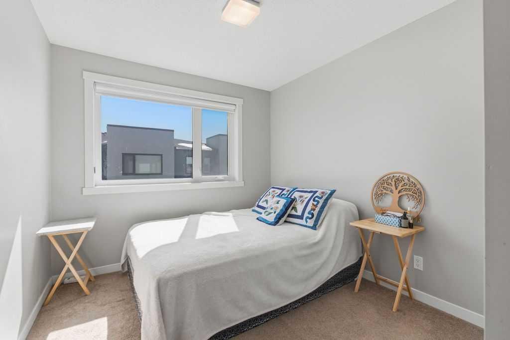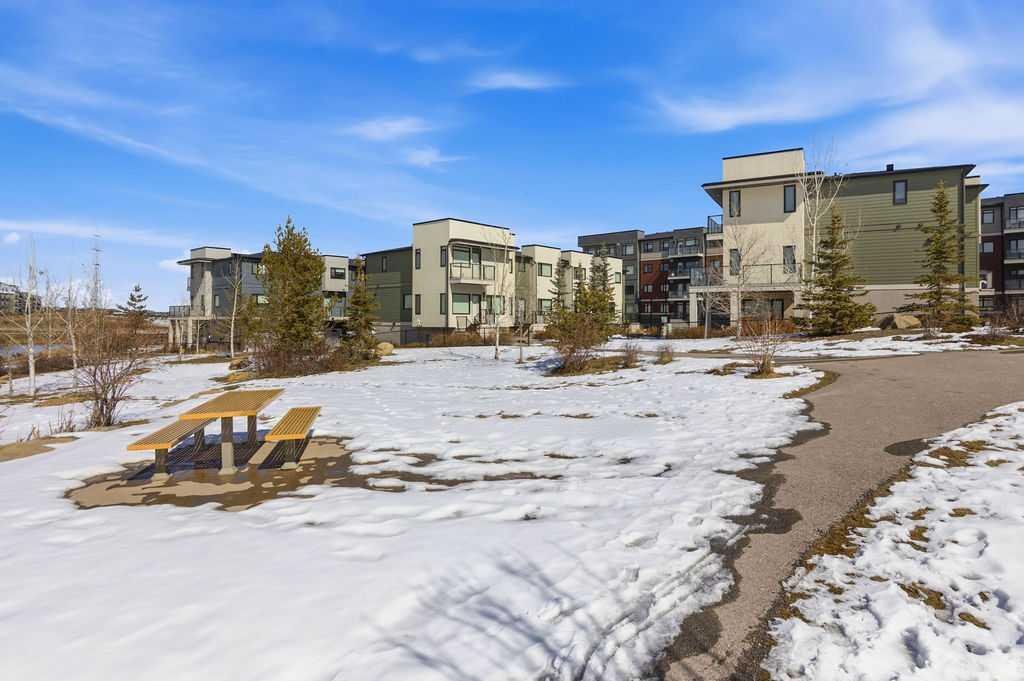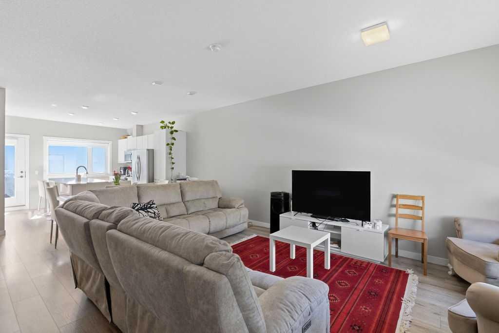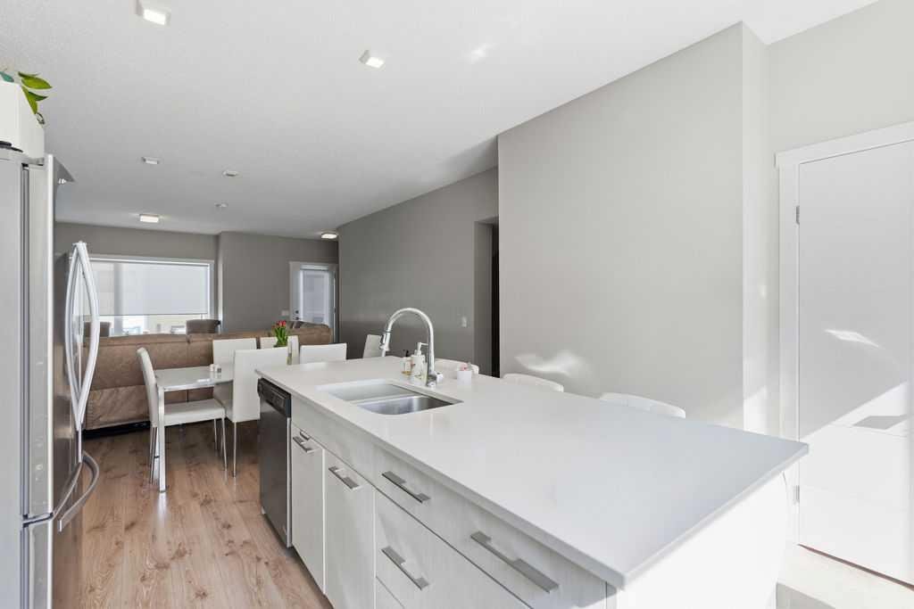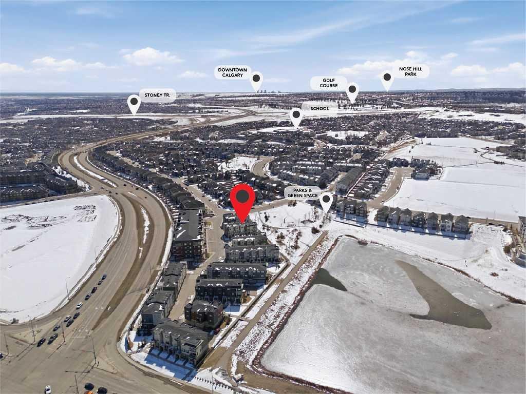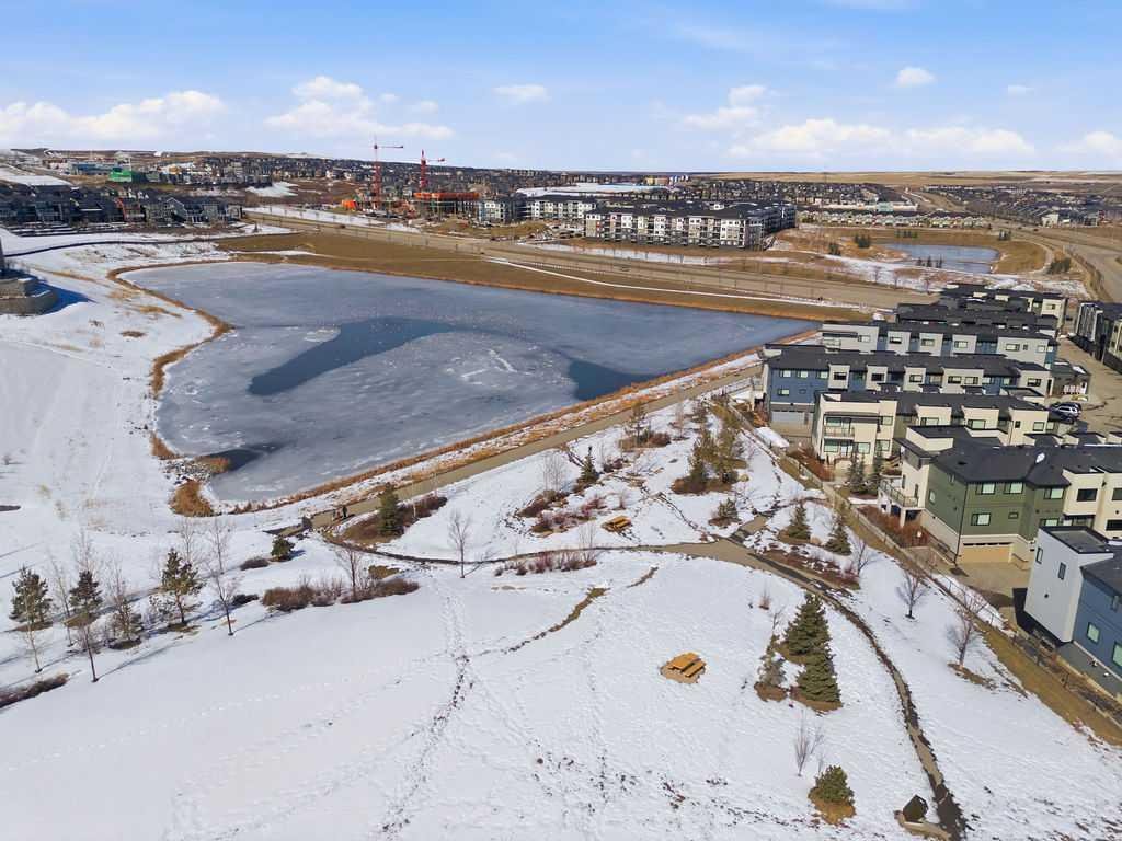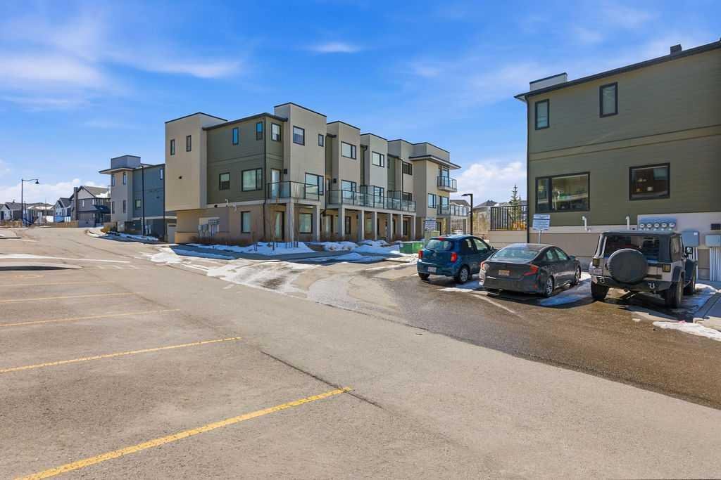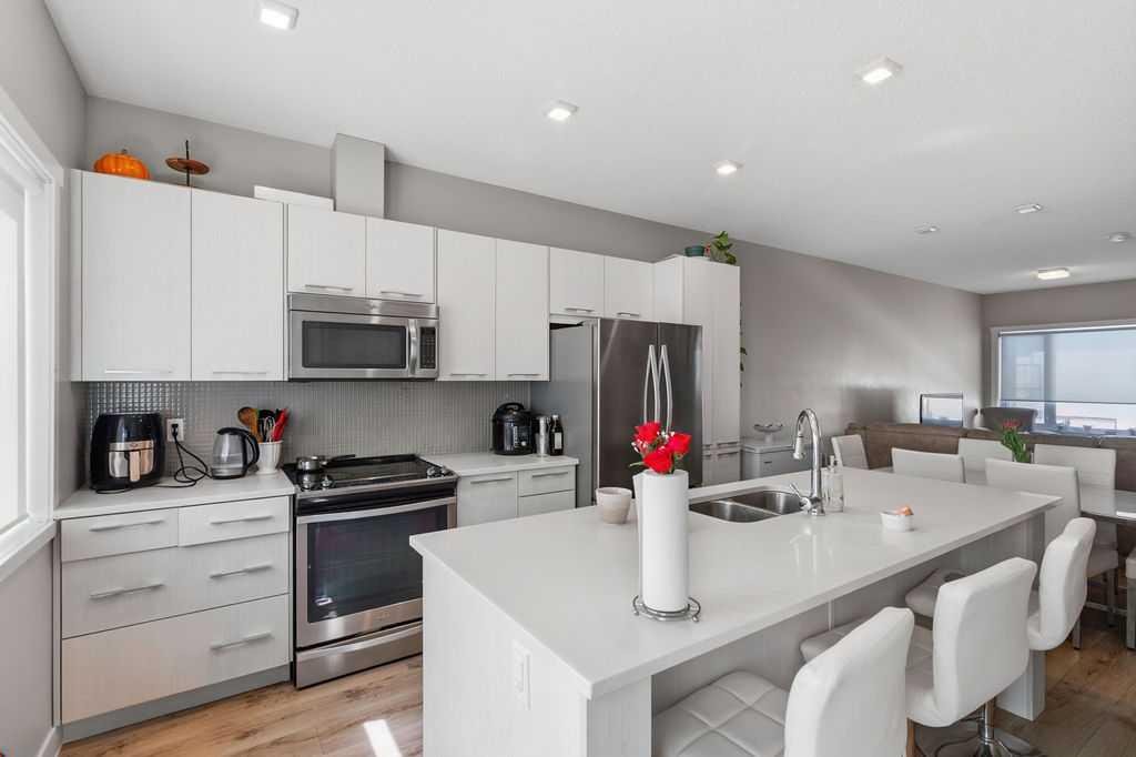 Welcome to this stunning and beautifully appointed townhome in the highly desirable Diseno community of Sherwood. Offering 1,576 sq. ft. of thoughtfully designed living space, this home seamlessly blends modern style, comfort, and functionality—ideal for families, professionals, or those seeking low-maintenance living without compromise. The main level welcomes you with a bright and spacious flex room, perfectly suited for a home office, gym, or guest space. Large windows fill the area with natural light while showcasing peaceful views of the surrounding greenspace, creating an inviting and versatile environment. This level also provides convenient access to the double attached garage, making everyday living effortless. Upstairs, the second level reveals an impressive open-concept layout designed for both relaxing and entertaining. The spacious living room is anchored by natural sunlight, creating a warm and welcoming atmosphere. The adjacent dining area flows seamlessly into the contemporary kitchen, which is sure to impress with its sleek quartz countertops, stainless steel appliances, modern cabinetry, stylish backsplash, and a large island with breakfast bar seating—perfect for casual dining or hosting guests. A standout feature of this home is the presence of two private balconies—one off the living room and another off the kitchen—both offering tranquil pond and greenspace views. These outdoor spaces provide the perfect setting to enjoy your morning coffee or unwind in the evening. The upper level is thoughtfully laid out to maximize comfort and privacy. The spacious primary bedroom serves as a relaxing retreat, complete with a walk-in closet and a private 3-piece ensuite with a stand-up shower. Two additional generously sized bedrooms offer flexibility for family, guests, or workspace, and are complemented by a full 4-piece bathroom. Convenient in-suite laundry on this level adds to the home’s overall practicality. Situated in the sought-after community of Sherwood, this home offers exceptional access to nearby amenities, including Beacon Hill and Sage Hill shopping centres, schools, public transit, parks, and an extensive network of walking paths. With quick access to major roadways, commuting is simple and efficient. Combining a functional layout, modern finishes, beautiful views, and a prime location, this exceptional townhome presents a rare opportunity to enjoy elevated living in one of NW Calgary’s most desirable communities.