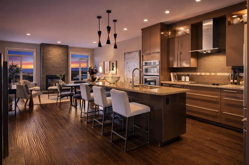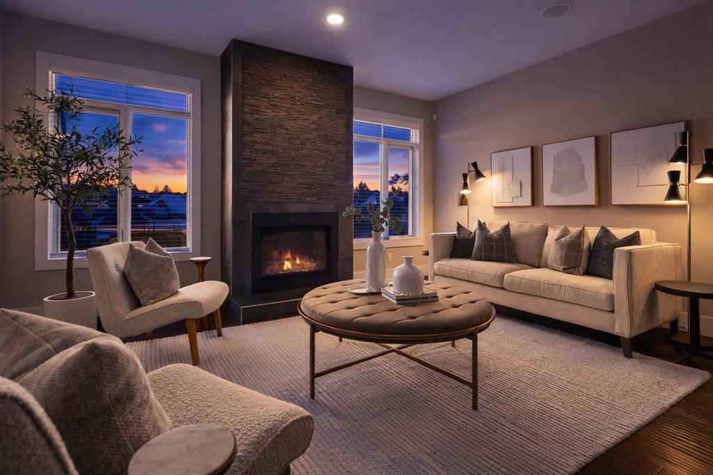 The dramatic floor-to-ceiling textured fireplace commands attention, flames dancing against charcoal stone while Calgary’s prairie skies perform through flanking windows. Above, 3 peaceful bedrooms await, including a primary retreat with vaulted ceilings and spa-inspired ensuite featuring double vessel sinks, soaking tub, and rainfall shower with body sprays. The 923 sq ft finished lower level offers endless possibilities with additional bedroom or guest room, full bathroom, home office, gym, entertainment hub.