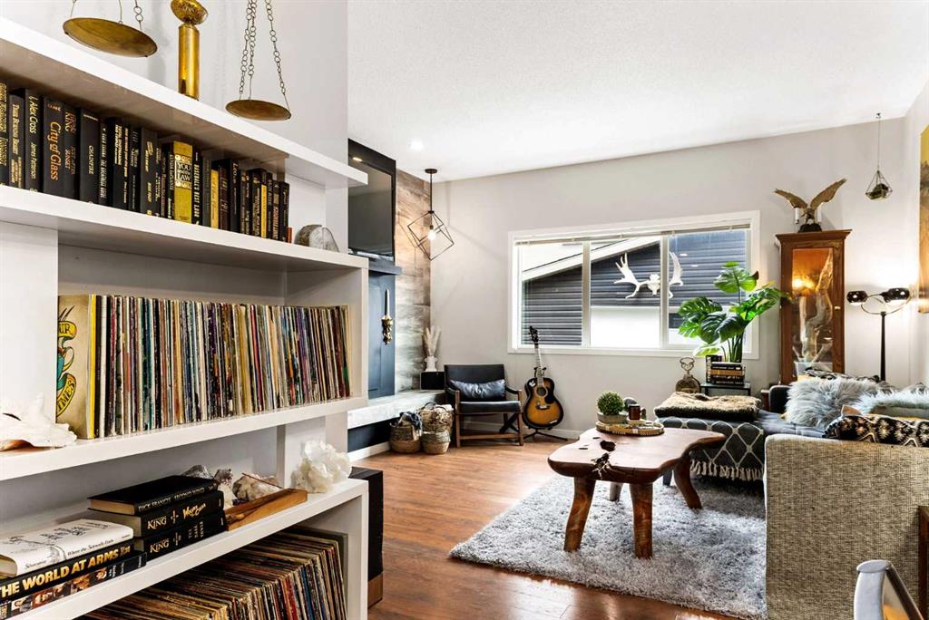 Inside, architectural details set the tone with a striking feature fireplace wall, full-height tempered glass architectural divider, built-in media shelving, and whole-home smart lighting and dimmers. The upgraded kitchen showcases quartz countertops, modern cabinet refacing, pull-out storage organizers, a stylish backsplash, and a smart fridge with a hidden pantry entry, blending sleek aesthetics with everyday functionality.