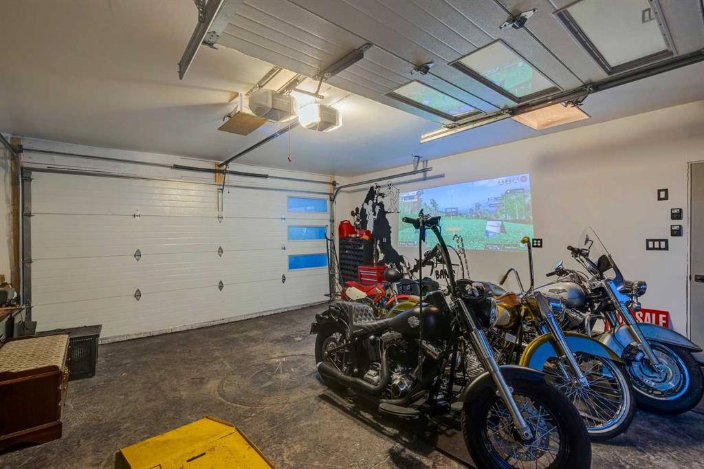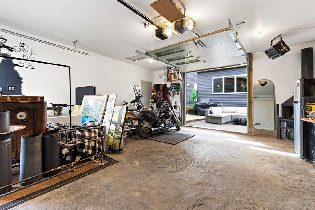 The fully finished garage transforms into an entertainer’s retreat with golf simulator capability, projector setup, custom storage, and a rare wood-burning garage fireplace, creating a truly one-of-a-kind space.