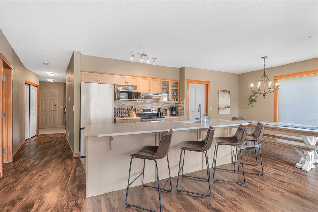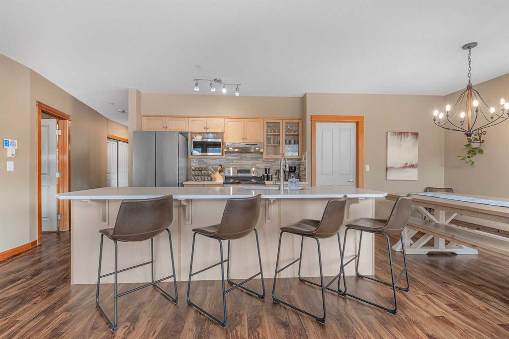 Welcome to Canmore Crossing, a centrally located and highly sought-after complex offering the perfect blend of lifestyle, convenience, and investment potential in the heart of Canmore. This 1100sqft, well-appointed 2-bedroom, 2-bathroom unit features a bright, open-concept layout with a functional floor plan designed for both everyday living and weekend escapes. The spacious kitchen flows seamlessly into the dining and living areas, creating an inviting space for entertaining or relaxing after a day in the mountains. Large windows bring in natural light and showcase stunning mountain views, while the private balcony offers the perfect spot to unwind and take it all in. The primary bedroom includes a generous closet and full ensuite, while the second bedroom provides flexibility for guests, family, or a home office setup. Owners and guests enjoy access to desirable amenities, including a fitness area and hot tub, along with secure underground parking and convenient elevator access. Located just steps from shops, restaurants, trails, and transit, this property offers exceptional walkability and easy access to everything Canmore has to offer. Being Tourist-zoned, this property offers the widest range of flexibility. Whether you’re looking for a full-time residence, weekend retreat, or short-term rental property, this is a fantastic opportunity in one of Canmore’s most accessible and well-established communities.