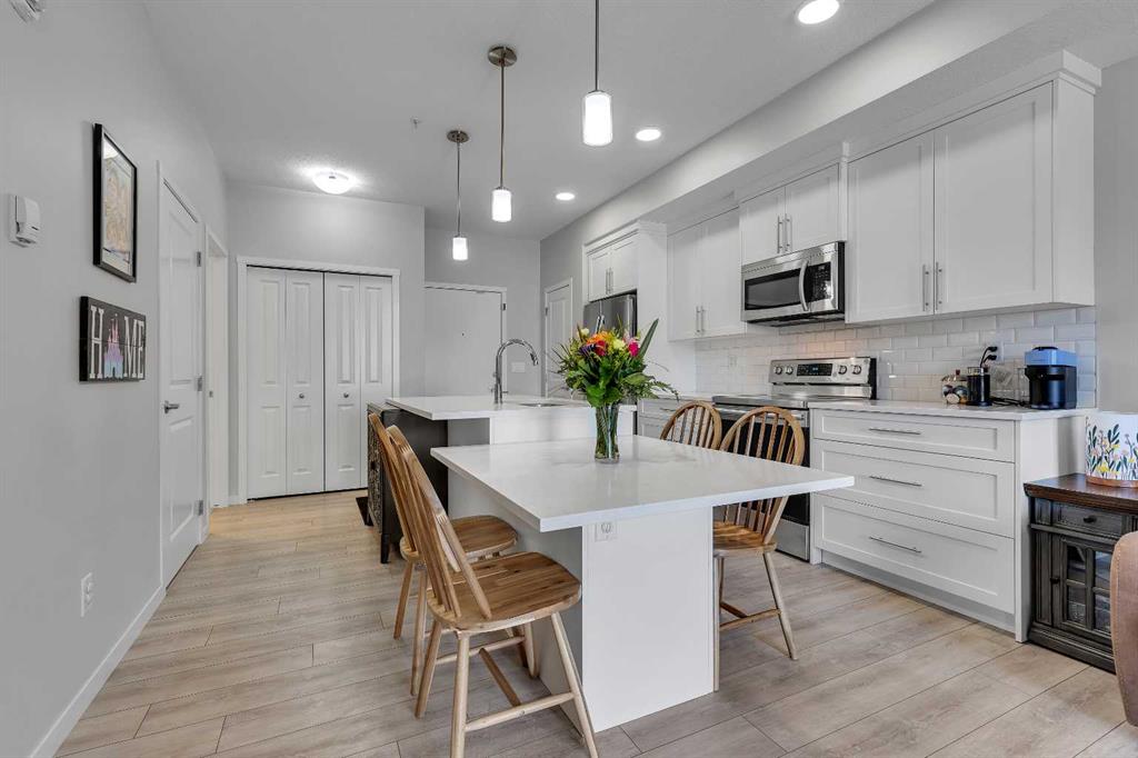 2nd floor original owner west facing unit over looking a green space, located in the Lake community of Harvest Hills. Shows pride of ownership, the upgrades include: LVP flooring, stainless steel appliances, closet organizer in 2nd bedroom, pull out drawers in kitchen & bathroom, quartz counters, gas line for bbq & underground parking. This bright open unit features 2 bedrooms, full bathroom, laundry, spacious living room offering patio doors that lead to the west facing deck & a good size kitchen that offers a larger island that has a lower section for eating. Close to schools, shopping, Vivo, Library, bus, green spaces restaurants & all other amenities. Click on link to view 3D walk through.