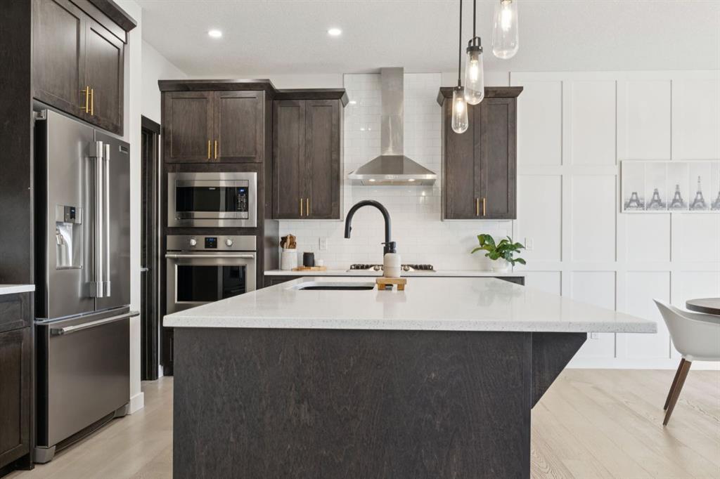 A bright OPEN-TO-BELOW foyer welcomes you with expansive windows and beautiful EXPOSED CEILING BEAMS that highlight the home’s architectural charm. The main floor offers a dedicated OFFICE, a stylish powder room, and added ease with the NEST SMART SYSTEM. The gourmet kitchen serves as the centrepiece, showcasing UPGRADED APPLIANCES, a gas cooktop with chimney hood fan, an oversized island, and STRIKING FEATURE WALLS. The adjoining living room is warm and inviting with its GAS FIREPLACE and airy, light-toned finishes.