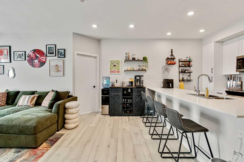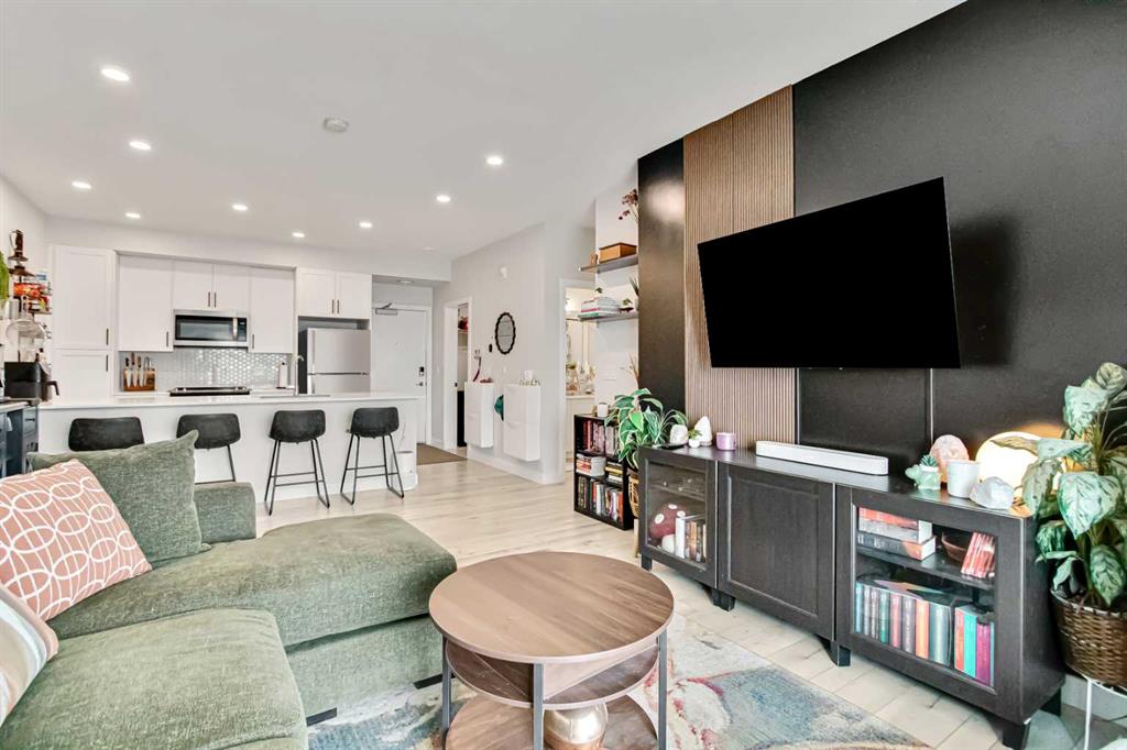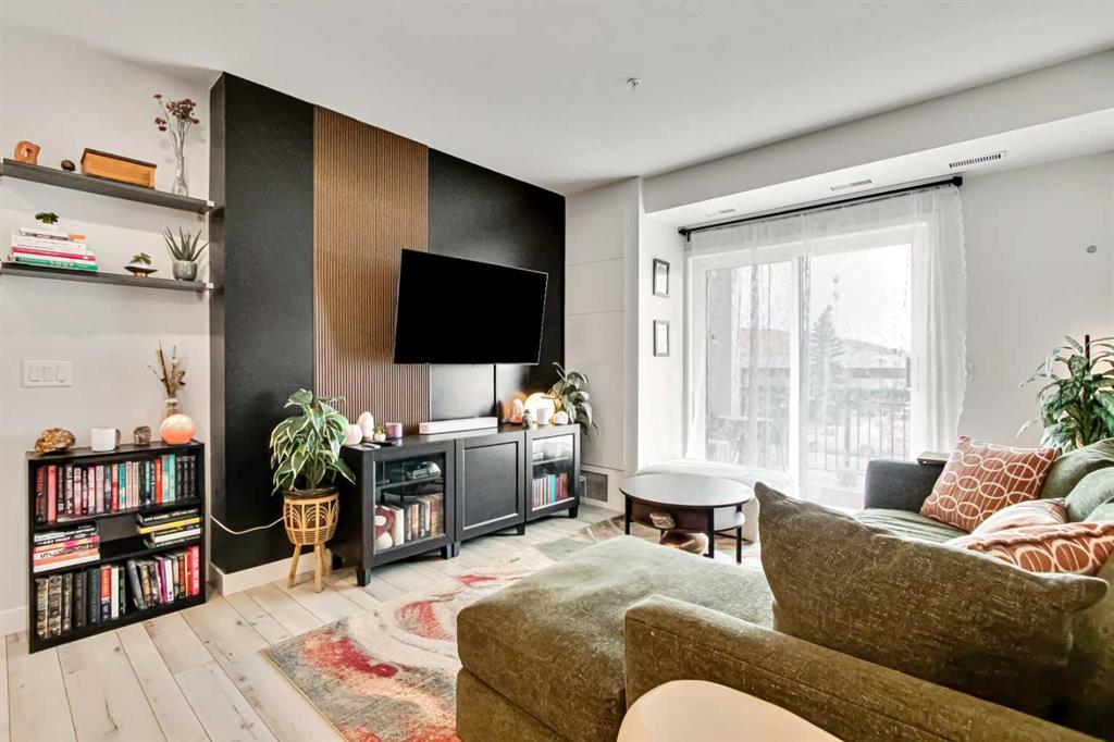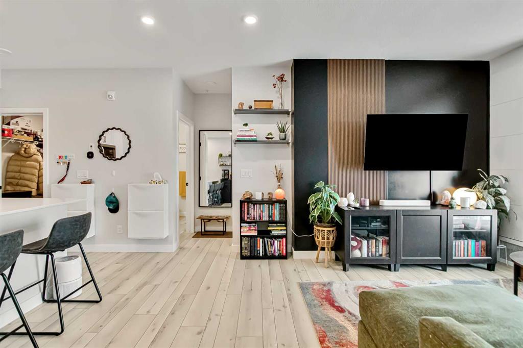 Inside the kitchen is both stylish and functional, complete with quartz countertops, stainless steel Whirlpool appliances and a modern, cohesive color palette. Custom built shelving integrated into the cabinetry adds both character and practical storage. The living room is enhanced by a custom feature wall, creating a warm and elevated focal point.