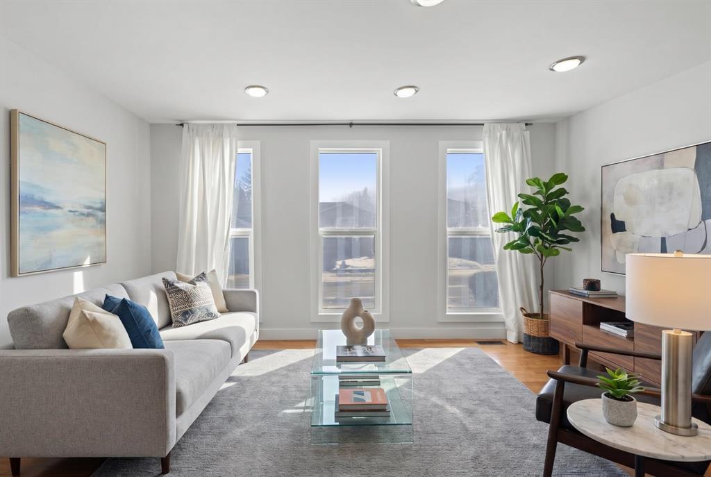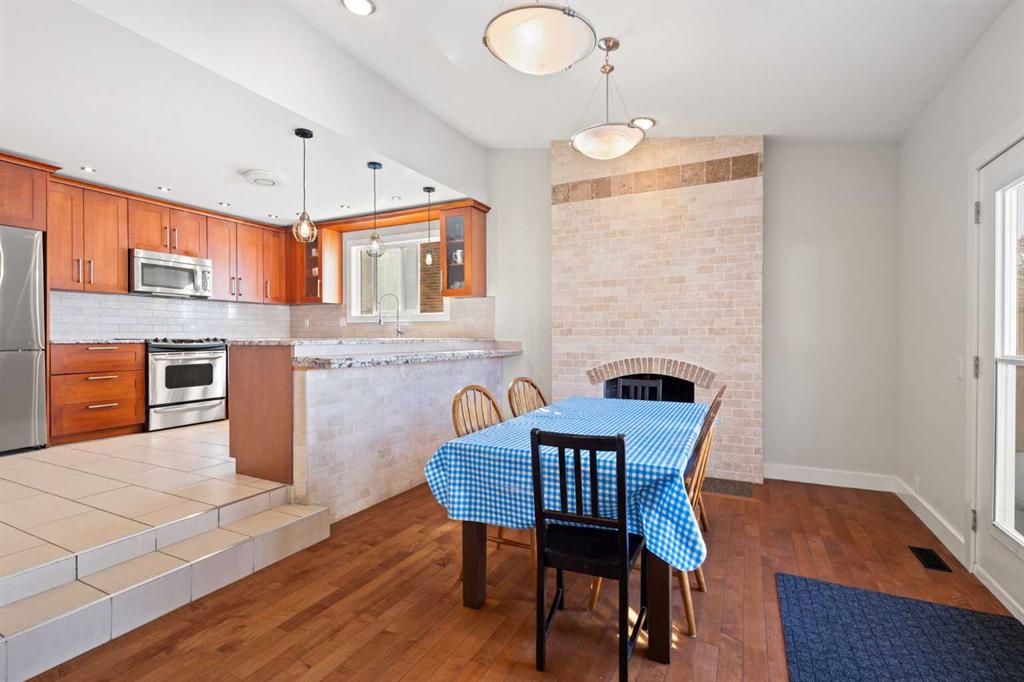 The main floor features hardwood flooring and a bright open living space with large windows that bring in plenty of natural light. The updated kitchen includes granite countertops, stainless steel appliances, modern lighting, and a raised eating bar that opens to the dining area. A wood-burning fireplace adds warmth and character, creating a comfortable space for everyday living or entertaining.