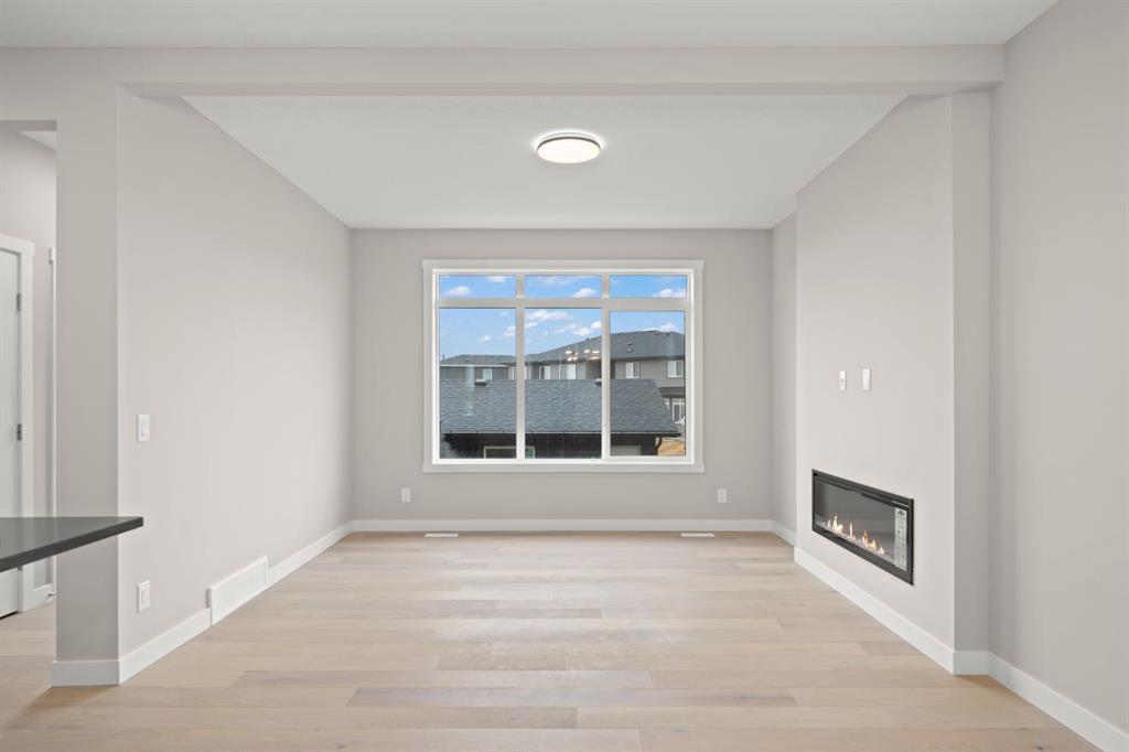The open concept main floor features 9-foot ceilings, durable engineered hardwood, and a bright, welcoming atmosphere. The kitchen shines with quartz countertops, stainless appliances, and a large island perfect for busy mornings, casual meals, or hosting friends. Large windows flood the space with natural light, while the electric fireplace adds a cozy touch.