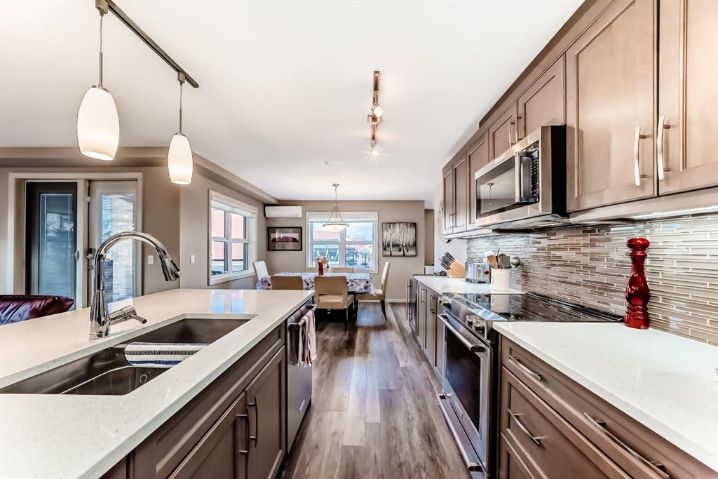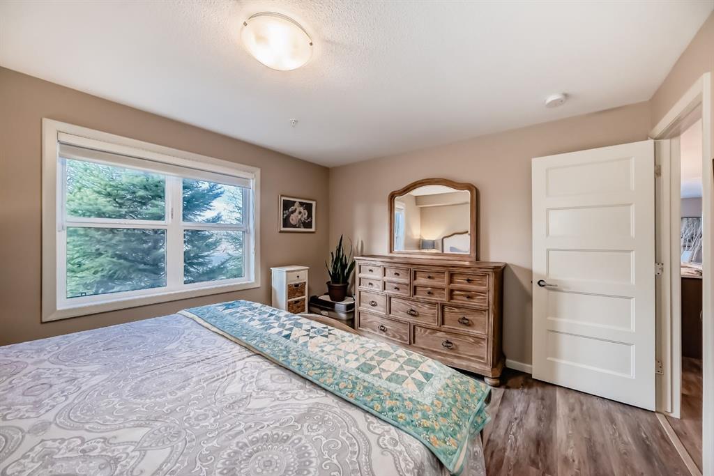 Welcome to The Chateaux at King’s Heights — Airdrie’s premier 55+ condominium, where luxury, comfort, and convenience come together. This exceptional corner suite is the LARGEST unit in the building, showcasing two spacious bedrooms, a bright den, and a sun-soaked south-facing layout designed for elegance and ease. Every detail has been elevated with the Alto Premium Upgrade Package and over $35,000 in additional enhancements, including upgraded tile and cabinetry, luxury vinyl plank flooring, a stunning floor-to-ceiling stone gas fireplace, in-floor radiant heating, air conditioning, a garburator, and a full alarm system with window and door sensors plus keypad entry on both exterior doors.