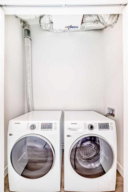 Quartz countertops continue into the bathrooms, and a stacked washer and dryer add everyday convenience. This home also includes a titled surface parking stall and is backed by the Alberta New Home Warranty for peace of mind.