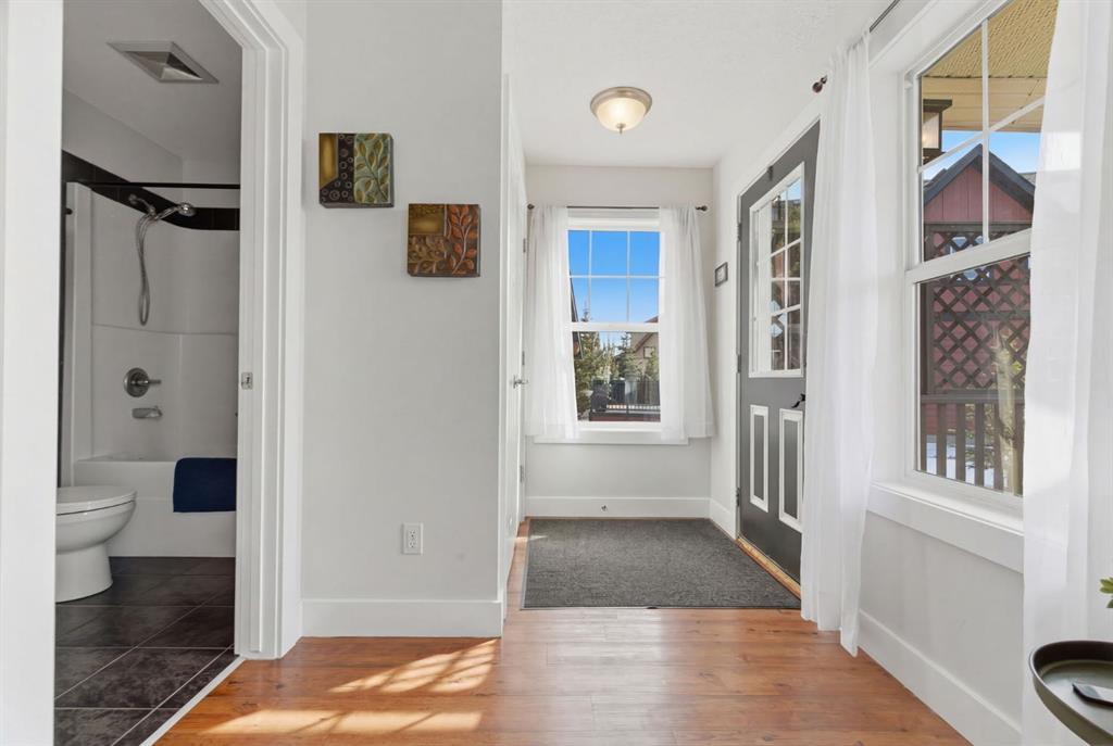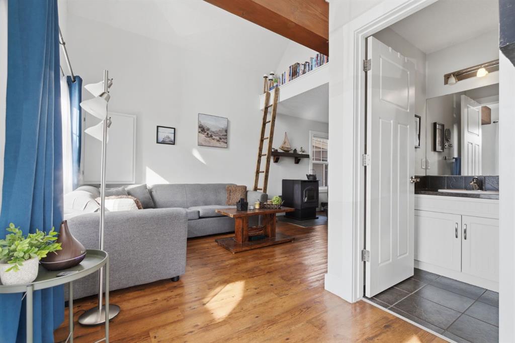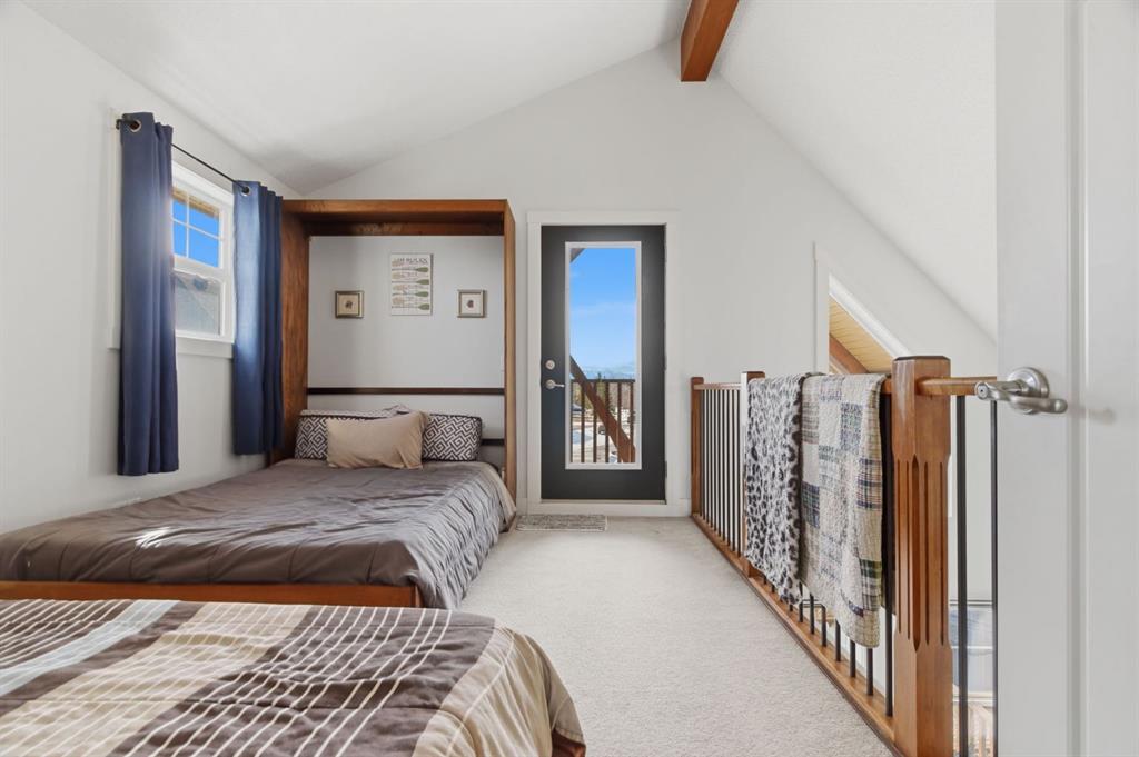 The main cottage has been recently updated and welcomes you with a bright front living room with a stunning vaulted ceiling and large windows making the space airy and bright. The open living area is perfect for relaxing or entertaining, while the kitchen was refreshed in 2023 with new countertops, appliances, and sink. A 4-piece bathroom completes the main level. Upstairs, the lofted design features two bedrooms, including a loft-style space that can be a third bedroom and is complete with a Murphy bed making this a great flex space. The loft offers access to a balcony deck where you can enjoy your morning coffee or evening sunsets as you take in the beautiful views of the lake and mountains.