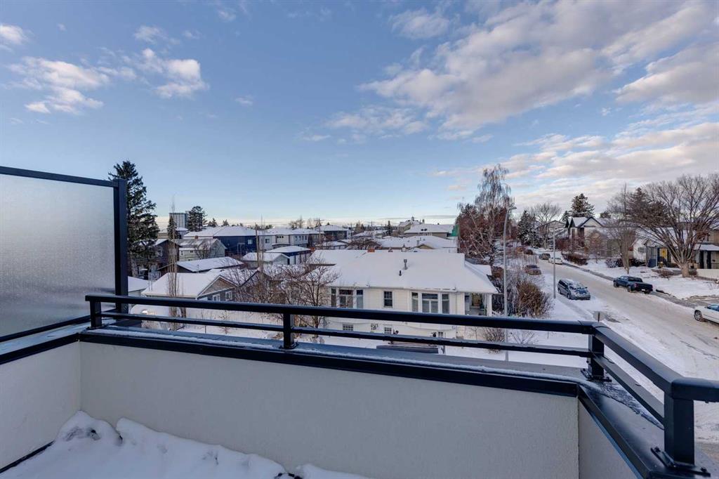 Mount Pleasant – 2122 7 Street NW: Welcome to this beautiful townhome offering 3 bedrooms, 4.5 bathrooms, a single-car garage, and over 2,100 sq ft of developed living space. Designed by respected Calgary architect John Trinh and Associates, this project showcases high-level craftsmanship, thoughtful material selection, and exceptional attention to detail throughout. The main floor features a spacious front entry, a bright living room with an electric fireplace and built-in shelving, and a central kitchen complete with stainless steel appliances, an island with seating, a pantry cupboard, and a dining area with access to the deck. A convenient two-piece powder room completes this level. The second floor offers two generously sized bedrooms, each with its own ensuite, one with a four-piece bathroom and the other with a three-piece. A well-equipped laundry room with cabinets, a sink, and a folding counter adds everyday convenience. The entire third level is dedicated to the primary retreat, featuring exclusive access to the top-floor balcony, a walk-in closet, and a luxurious five-piece ensuite with dual sinks, a soaker tub, and a walk-in shower. The lower level features a legal studio suite with a private entrance, its own full kitchen equipped with stainless steel appliances, a comfortable living area, and a four-piece bathroom. Ideally located in the heart of Mount Pleasant, one of Calgary’s most desirable mature communities, this home offers easy access to Confederation Park, SAIT, and the University of Calgary. Enjoy a quick commute to downtown along with nearby transit routes on 4 Street, Centre Street, and 20 Avenue, plus a great selection of local restaurants and coffee shops.