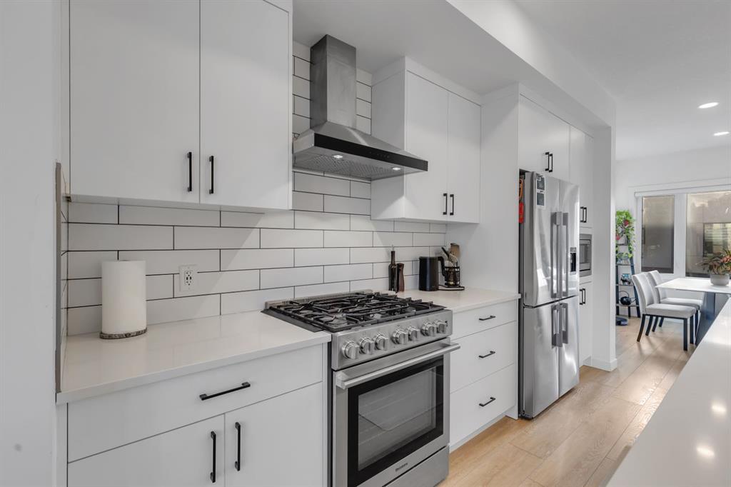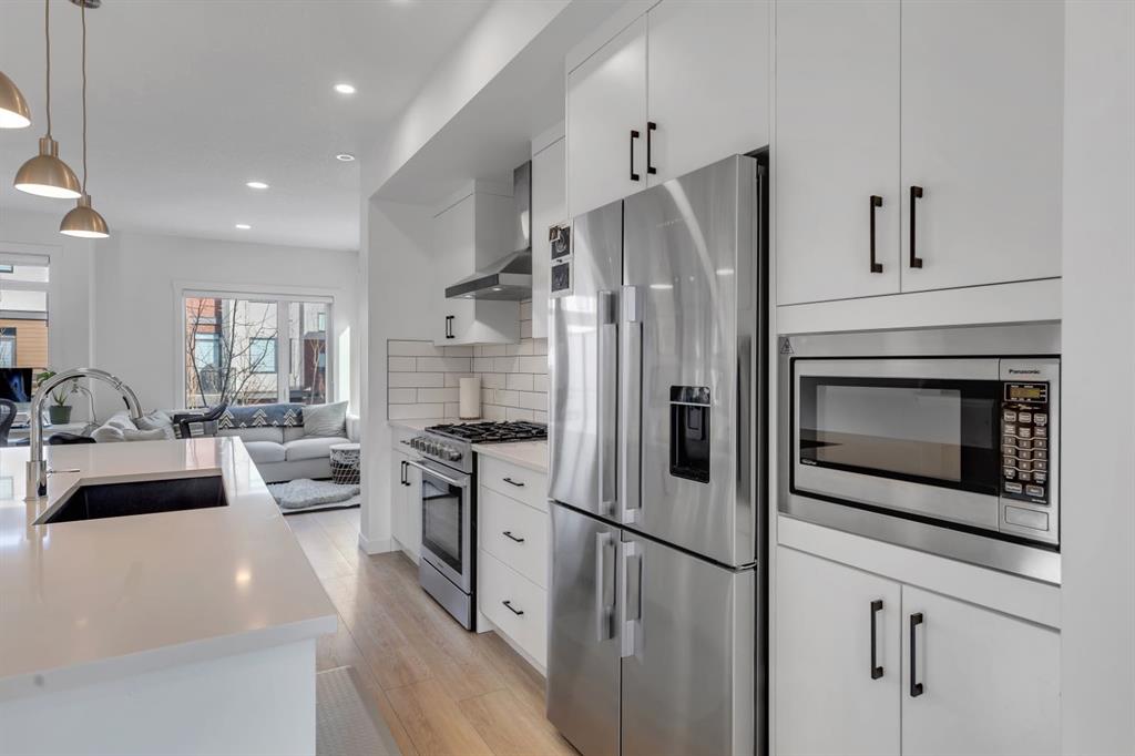 | Open Housing Event Saturday January 31st from 12:00-4:00pm and Sunday February 1st from 12:30-4:00pm | Welcome to the Amara Corner Lot Design Plan in Greenwich NW Calgary. This New York–inspired executive townhome offers 1,584 square feet of open-concept living in one of Calgary’s most desirable northwest communities. Featuring a 3-bedroom + den layout with 3.5 bathrooms, this thoughtfully designed home includes a double-wide garage with a single oversized door and a private driveway, maximizing both parking and storage. Professionally curated interior colour packages and an abundance of builder upgrades elevate the home throughout. Crafted with attention to detail, the residence showcases exceptional finishes paired with outstanding natural light. The north-facing frontage overlooks the community’s central courtyard and pathway system, while east-side and south-backing exposures flood the home with sunlight through expansive corner windows. Outdoor living is enhanced by a walkout exposed aggregate patio facing the courtyard and an elevated glass-panelled balcony, offering both privacy and scenic views. Inside, you’ll find luxury vinyl plank flooring on the main and lower levels, quartz countertops on all floors, 9-foot ceilings throughout, and stainless steel upgraded gourmet appliances, including a gas stove and chimney hood fan. High-efficiency features include triple-pane windows, a Navien on-demand tankless hot water system, and a heat recovery ventilator (HRV). This Amara corner plan is further enhanced by the Builder Show Home Package, adding a custom third full bathroom on the lower level, black interior door and bathroom accents, 8-foot solid interior passage doors, a full tile backsplash with custom grout design, and window coverings throughout. One of Landmark Homes’ most sought-after floor plans, this layout offers a functional galley kitchen with dedicated living and dining areas—perfect for entertaining and maximizing usable space. The exterior design channels classic New York brownstone style with James Hardie paneling, full brick accents, and stucco finishes for a contemporary, low-maintenance lifestyle. Ideally located just 18 minutes from downtown Calgary, 12 minutes to the University of Calgary and Foothills Hospital, under an hour to Banff and Canmore, and within walking distance to the new Calgary Farmers’ Market, this home offers unmatched convenience and community living. Book your showing today and discover what makes Greenwich NW an exceptional place to call home.
