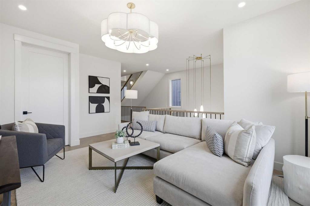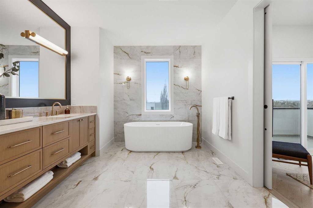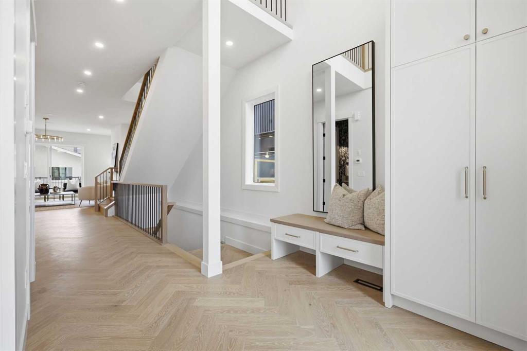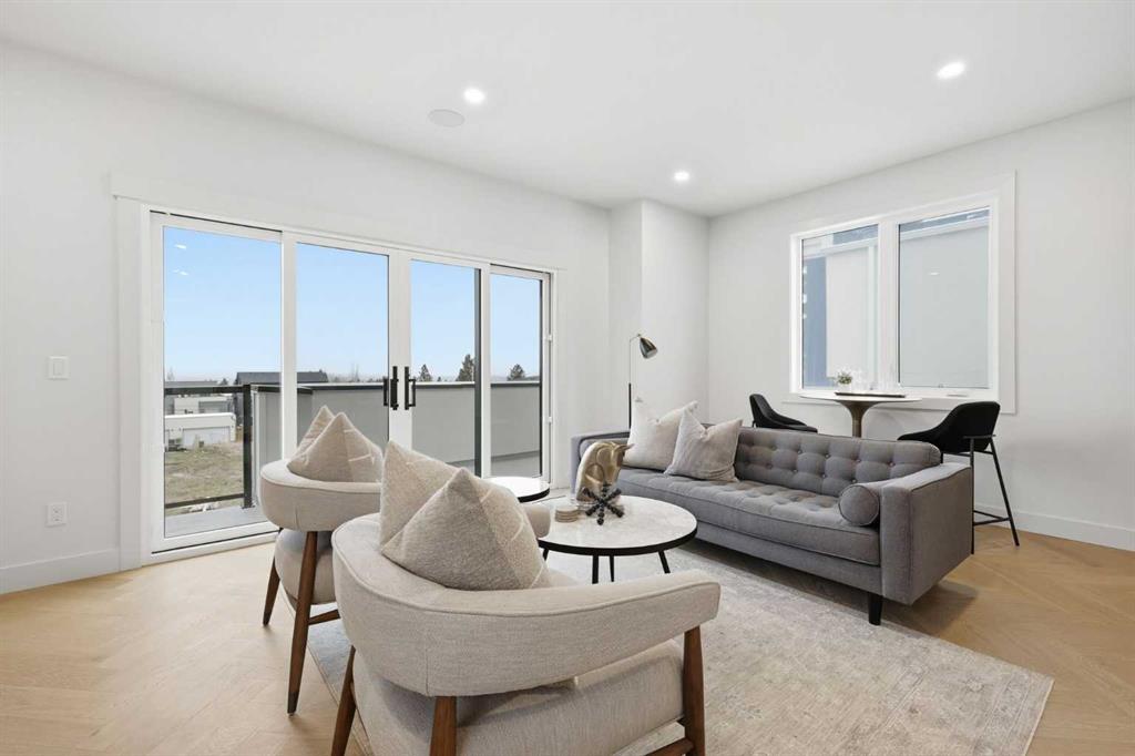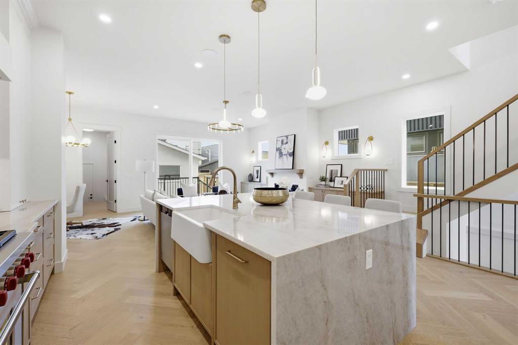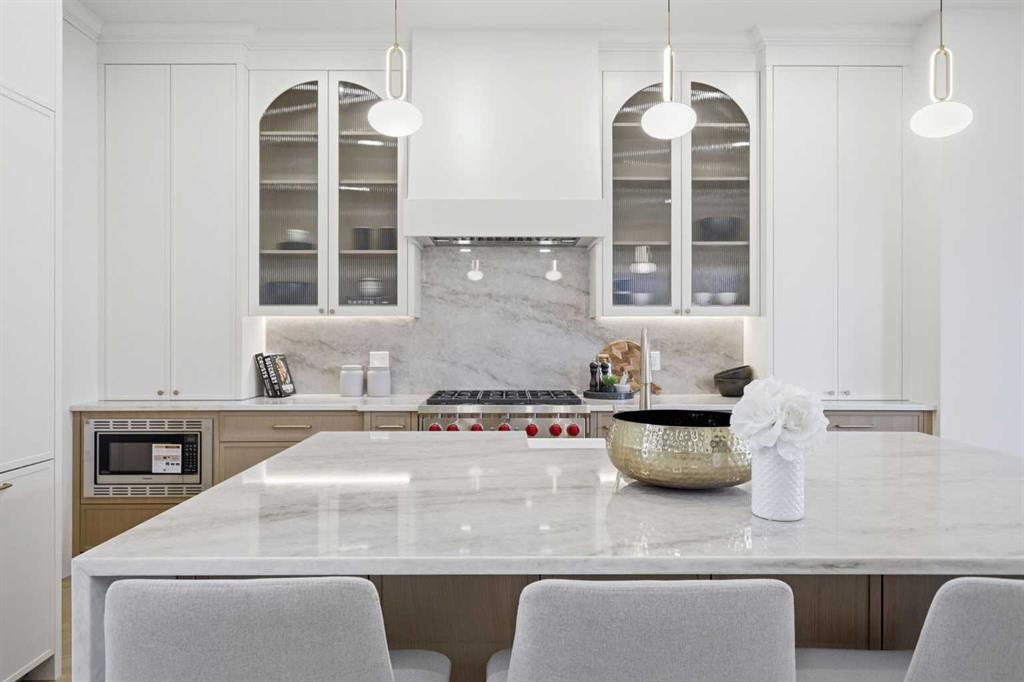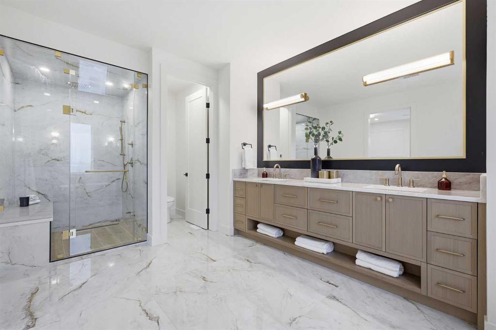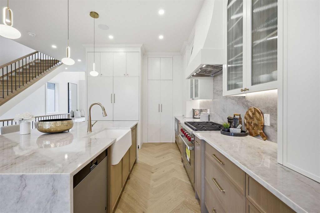 Beautifully positioned in the heart of Marda Loop on a quiet, tree-lined street and situated on a 31’x125’ lot, this super luxe residence offers over 4400 sq ft of developed living space and combines exceptional design, thoughtful functionality, and refined comfort. A sunny south-facing backyard and fully unobstructed city views set the stage for elevated inner city living. A private elevator services all levels—from the basement to the top floor—offering effortless accessibility for those looking to age in place or right-size without compromise. Inside, the home is rich with high-end finishes, including chevron-patterned hardwood flooring throughout, lofty ceilings and designer lighting with glass and bronze gold detailing, moody chandeliers and statement sconces. A spacious front dining room with statement wall panelling has ample space to host family & friends and is seamlessly connect to the kitchen through a beautifully appointed butler’s pantry. Entertaining and preparation are effortless in the chef’s kitchen that impresses with quartz counter tops, large waterfall island/eating bar, two-toned cabinetry and premium appliance package. Completing the main level is a 2 piece powder with wallpaper accent. A wide, light-filled staircase leads to the second level, where you’ll find a bonus room, a well designed laundry room, and two large bedrooms—each complete with its own private ensuite. The top floor is a true primary retreat, offering a private lounge/den, a wet bar, full city views, and direct elevator access. The luxurious primary suite features an exceptional walk in closet and a spa inspired ensuite with dual vanities, heated floors, freestanding soaker tub and a glass shower with bench which is roughed in for steam. The fully developed basement—also roughed in for in floor heat—includes a stylish built in bar, a massive recreation room ideal for movie nights, fitness space, or play, a fourth bedroom, and a beautifully finished three piece bathroom. Additional highlights include rough in for A/C, a fully landscaped and fenced yard, a front deck/balcony, and a timeless exterior design. Parking is a breeze with a double attached garage that is also roughed in for in floor heat. Just steps from the amenities of Marda Loop, close to transit, Crowchild Trail, parks, schools, and only a 10 minute drive to downtown Calgary, this home delivers the best of luxury and location in one exceptional package.