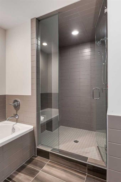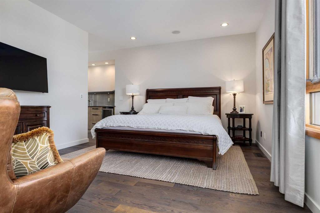 Occupying the entire upper floor, the primary suite is a private retreat featuring a spacious bedroom, terrace, lounge area, beverage station with sink, dishwasher, and beverage fridge, plus a custom walk-in dressing room. The elegant ensuite offers heated floors, deep soaker tub, oversized glass shower, private water closet, and refined finishes throughout. A large skylight brings in streams of light throughout the day.