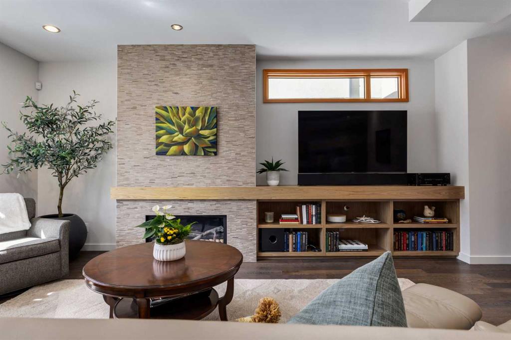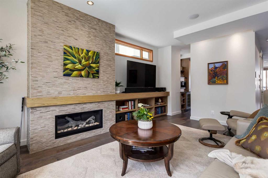 Striking street appeal and a private front courtyard create a memorable first impression. Inside, the main floor is bright and beautifully appointed, anchored by a sun-filled south-facing living room with expansive windows and a polished designer tile gas fireplace. Rich hardwood flooring, custom millwork, and built-in media speakers add warmth and sophistication throughout.