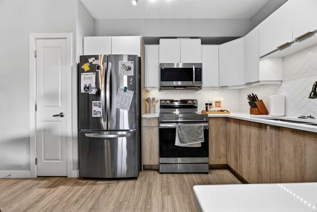 The thoughtfully designed interior showcases contemporary finishes throughout, including two-tone cabinetry, luxury laminate plank flooring, quartz countertops, a granite composite undermount sink, stainless steel appliances, and an open-concept layout that maximizes comfort and functionality.