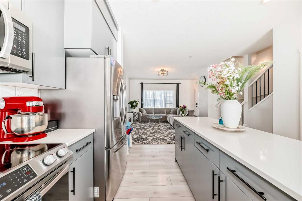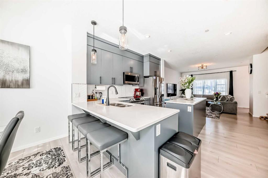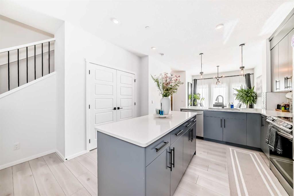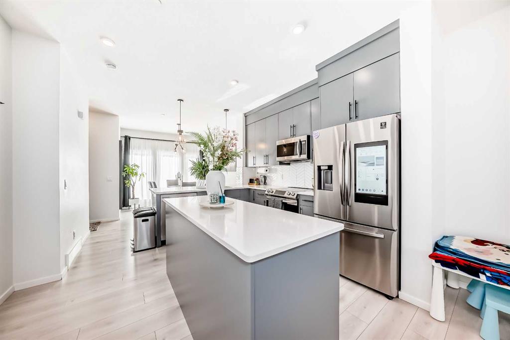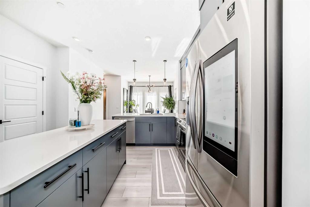 Modern & Bright 3-Bedroom Home in Desirable Livingston Welcome to contemporary living in the heart of the sought-after Livingston community! This stunning 3-bedroom home offers a modern design, stylish finishes, and a fantastic layout, perfect for a family or anyone looking for a move-in ready property with an exciting backyard space. Interior Highlights Step inside to a bright, open-concept main floor flooded with natural light. The inviting living room features a chic, neutral colour palette, beautiful flooring, and an elegant staircase, creating a sophisticated and comfortable space. The gourmet kitchen is a chef’s dream, boasting striking blue-grey cabinetry, pristine white quartz countertops, sleek stainless steel appliances (including a modern fridge with a smart display), and a large central island perfect for meal prep and entertaining. Adjacent to the kitchen, the dining room offers a stylish space for family dinners with an eye-catching light fixture and large windows overlooking the yard. A convenient and beautifully appointed powder room is also located on the main floor. Upstairs, you’ll find three generously sized bedrooms. The master suite is a true retreat, featuring a spacious layout, a large window with community views, a walk-in closet, and a private 3-piece ensuite bath. The two additional spacious bedrooms and a full main bathroom ensure comfort for everyone. For ultimate convenience, the laundry is also included on this level. Exterior & Community Features The home’s exterior boasts attractive curb appeal with its modern architecture and striking siding. The private backyard is an oasis for relaxation and fun, featuring a well-maintained lawn, a back lane for easy access, and charming raised garden beds—perfect for a home gardener! A dedicated fire pit area makes it ideal for cool Calgary evenings and entertaining guests. The Livingston community offers exceptional amenities, parks, and easy access to major routes, making it a highly desirable place to call home. Don’t miss the chance to own this exceptional property. Book your private showing today!