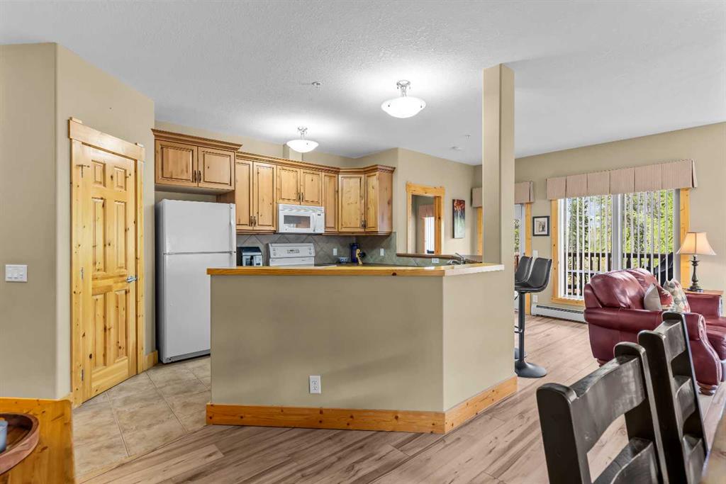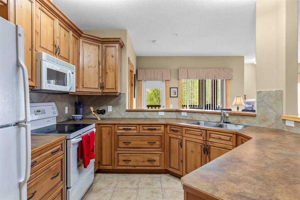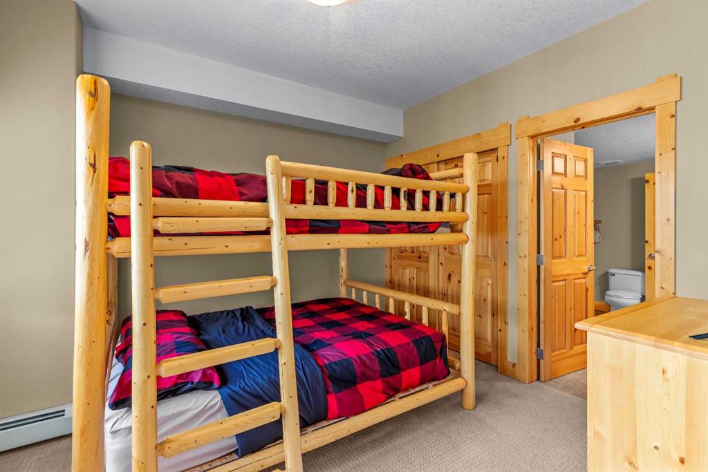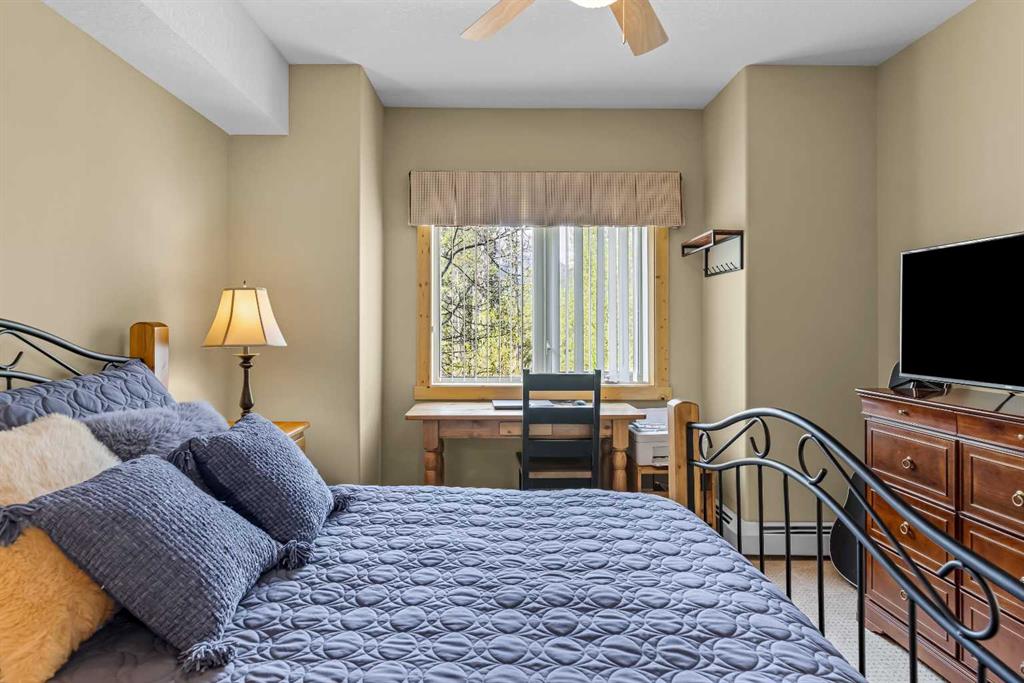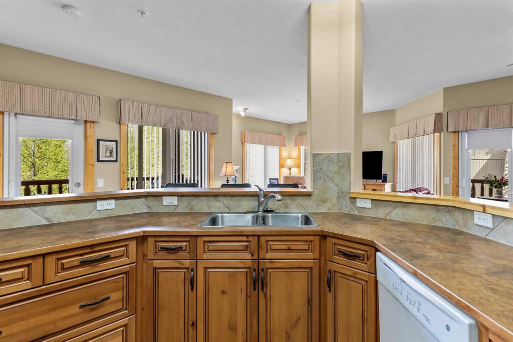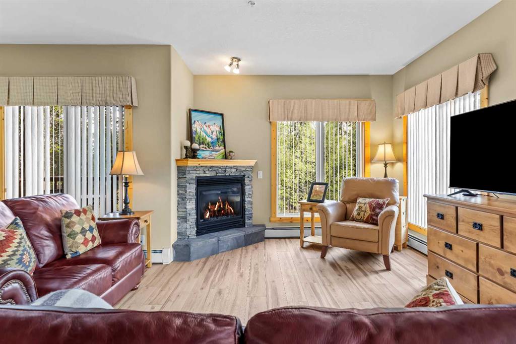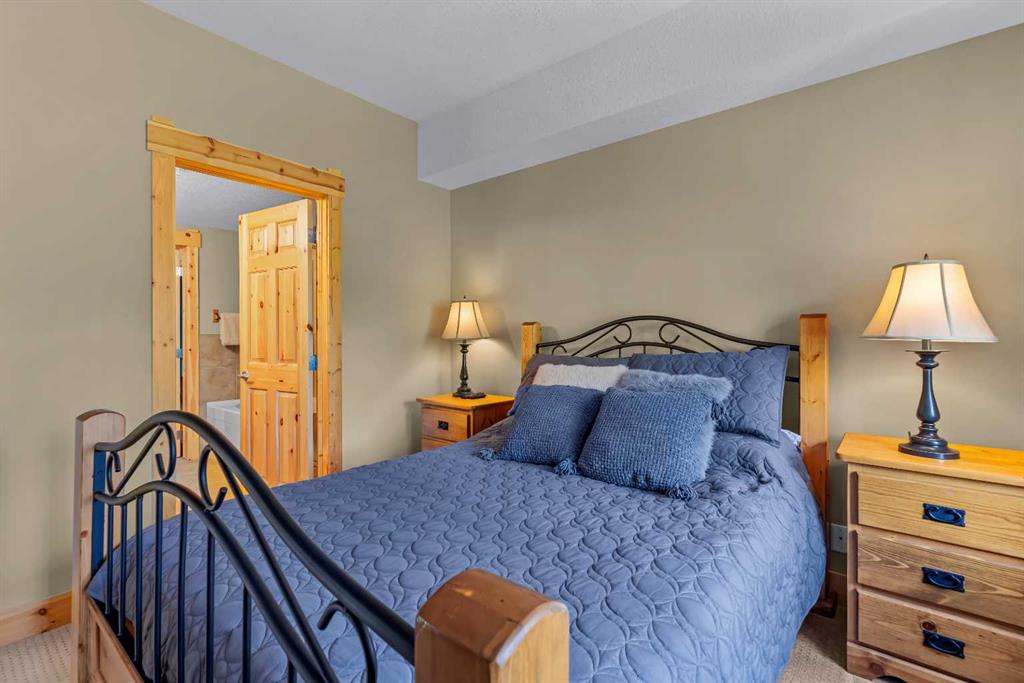 This thoughtfully laid out 2-bedroom, 2-bathroom corner unit offers 1,237 sq ft of bright, open-concept living space, featuring two spacious primary suites—each with its own ensuite. The main living area is enhanced by new luxury vinyl plank flooring, while two peaceful decks provide quiet outdoor retreats backing onto serene wooded greenspace—just steps from the Bow River. Owners enjoy access to a first-class clubhouse with an indoor pool, indoor/outdoor hot tub, sauna, steam room, fitness centre, theatre, event space, and games area with billiards, table tennis, and shuffleboard. Complete with titled underground parking and a secure storage locker, this is low-maintenance living in one of Canmore’s finest adult communities. Furnishings Negotiable.