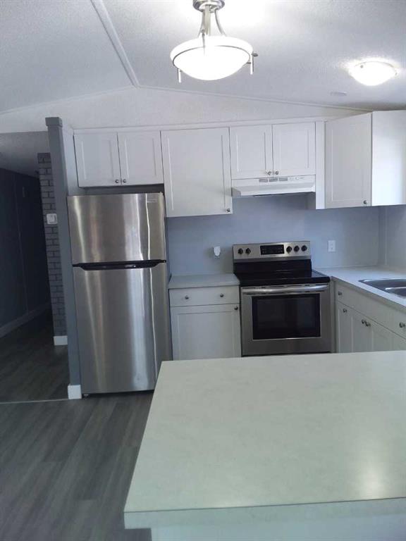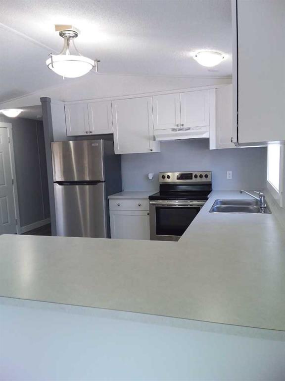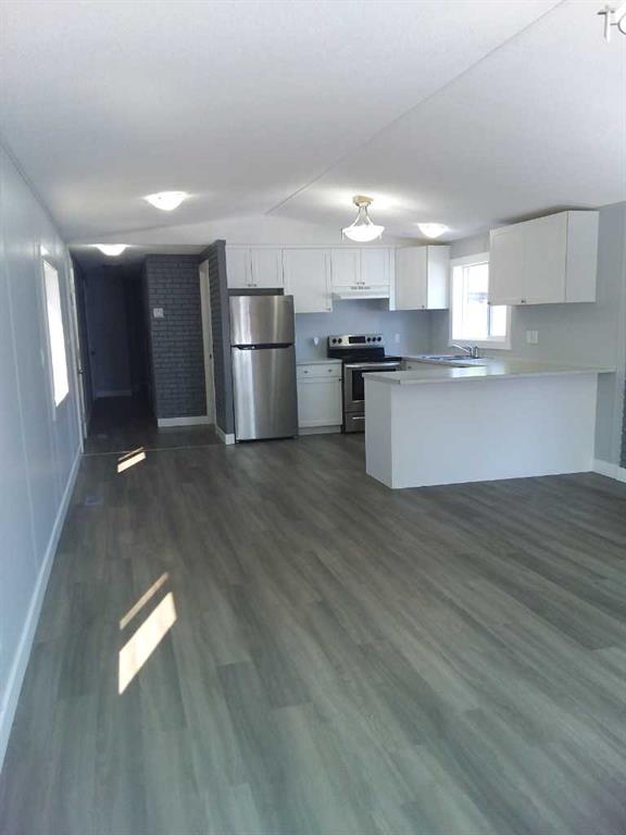 Affordable living at its best! Available immediately! This is a large (16×67 ft.) 3 bedroom, 2 bath beauty including double vanity sinks in the primary ensuite. It has been refurbished with stylish vinyl plank flooring throughout and completely repainted. The bright kitchen has luxurious white cabinets, a huge peninsula and stainless steel appliances – a double door fridge with freezer drawer, glass top stove and built-in dishwasher. A dryer is included. Every inch of this home is clean and fresh! The exterior has been reclad in maintenance free vinyl siding plus a steel roof on 2 x 6 walls for extra energy savings. New, double paned vinyl windows add to the comfort. This unit is located a short distance to the clubhouse which features a community gathering area with kitchen, a modern exercise room, an 8-ball pool table and games room plus common area playground and bbq area. Calgary Village is a quiet, family friendly community. Financing available at great rates upon approval. Beyond the purchase price, all sites in the park rent for $1,299 per month which includes water, sewer, garbage removal and clubhouse amenities. The clubhouse offers a modern exercise room, a games room with pool table, common areas with large screen t.v., community kitchen, bbq’s and children’s playground. There are no additional costs for these amenities. Although this sounds high, it includes many amenities not available at other parks.